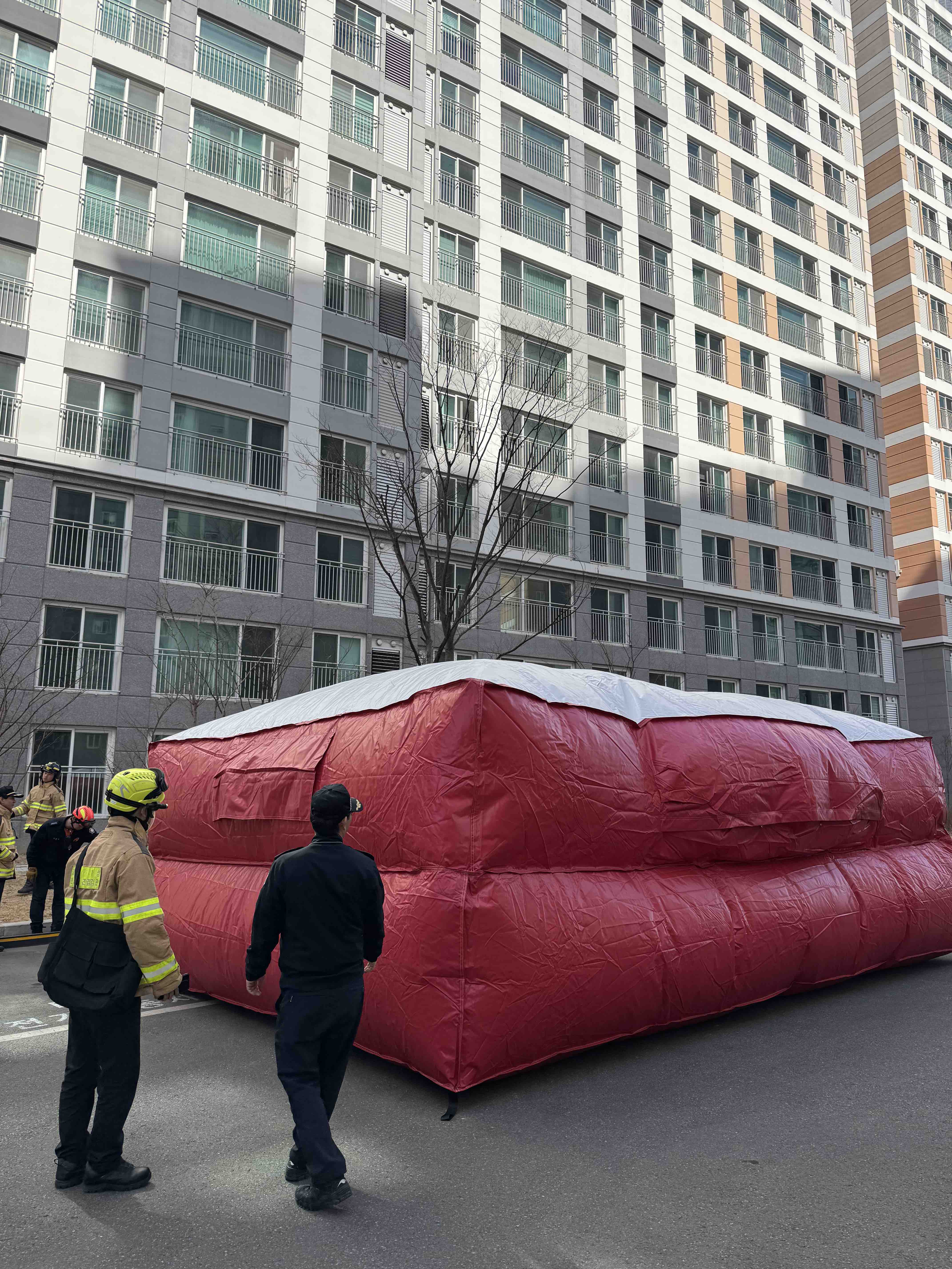 훈련은 ▲피난대피훈련 ▲소방차량 배치 및 지휘체계훈련(소방차 부서 위치 선정) ▲지하주차장 무선통신망 확립 ▲고가사다리차 전개 및 에어매트 훈련 등으로 진행됐다.