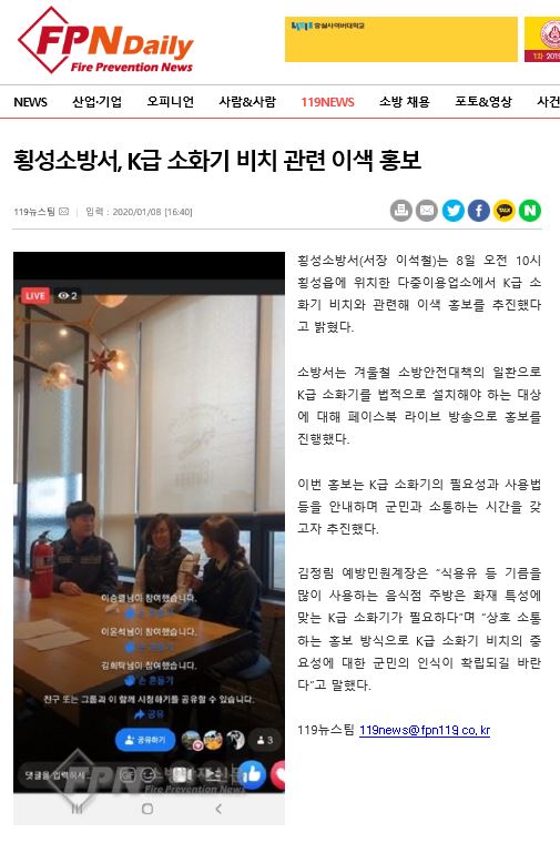 | 2400 | 횡성소방서, K급 소화기 비치 관련 이색 홍보 | 예방민원계 | 2020-01-09 | 674 | |