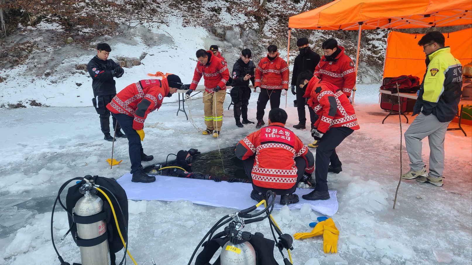 이번 훈련은 동계 수난사고에 대한 현장 안전관리 및 요구조자 응급처치 능력 배양, 수난전문의용소방대와 협업을 통한 현장대응 능력을 강화하고자 횡성구조대와 수난전문의소대가 참가한 상태에서 실시하였습니다.