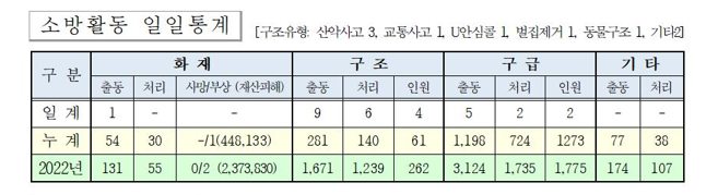 ○ 구조 9건(산악 3, 교통 1, U안심콜 1, 벌집 1, 동물 1, 기타2)