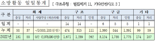 ○ 구조 14건(기타안전사고 3, 벌집 11, )