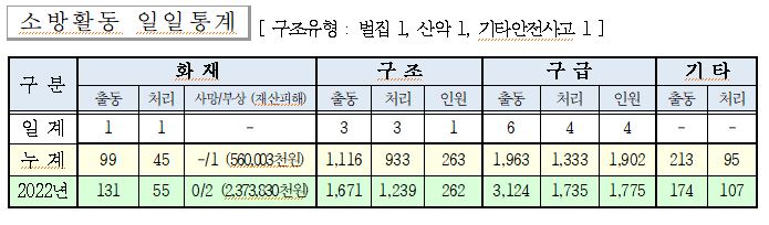 ○ 구조 3건(벌집제거 1, 산악사고 1, 기타안전사고 1)