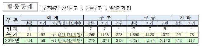 ○ 구조 7건(산악사고 1, 동물구조 1, 벌집제거 5)