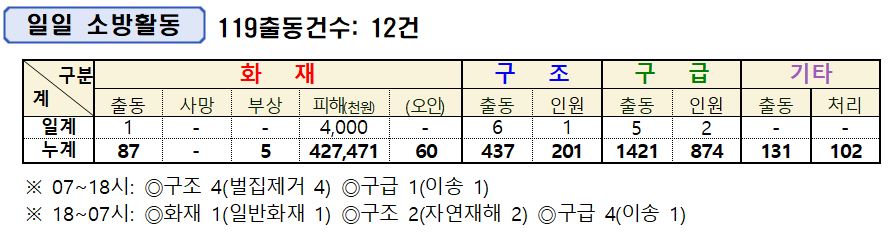 인제소방서 일일소방상황(9. 12.)