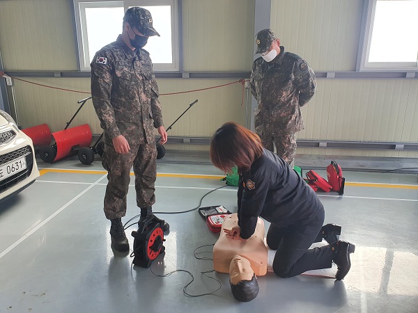 교육훈련담당자는 센터를 방문해 응급처치교육을 받았고 이후 소방서에서 대여한 교육용 자동제세동기를 사용해 예하부대 내 전파교육을 진행한다.