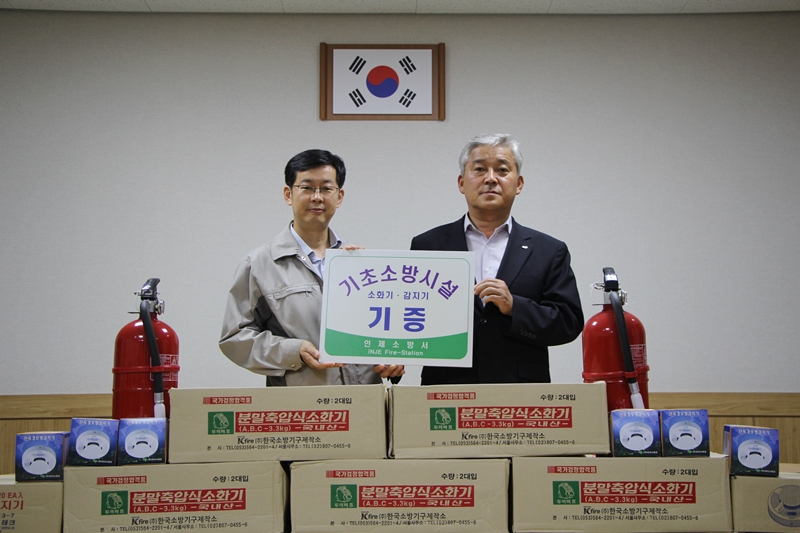 인제소방서(서장 김용락)에서는『1가정 1소화기 갖기』운동의 일환으로 2013. 4. 26일부터 기초소방시설 기증창구를 개설하여 운영하고 있는 가운데 7. 24.(수) 10시 ㈜태영건설에서 인제소방서를 방문하여 기초소방시설(소화기50대, 감지기50개)을 기증하였다. 이번에 기증된 기초소방시설은 화재 없는 안전마을 조성 및 독거노인, 장애인시설, 소년소녀가장 등 화재취약 계층에 대하여 보급․설치할 예정이다.