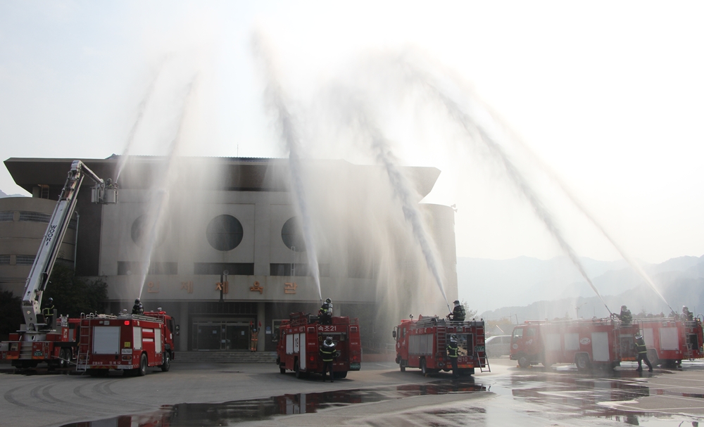 이번 훈련은 대테러진압, 요구조자 구조 및 환자 이송, 인제군긴급통제단 가동, 화생방 테러 대비 제독훈련, 대형화재 진압 및 재난 복구 순으로 진행되었다.