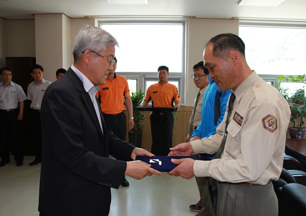 인제소방서(서장 김용락)는 5. 19일 10시 본서 서장실에서 화재진압활동 민간인 유공자 3명에 대하여 강원도지사 표창을 전수하였다. 표창대상자(국립공원관리공단 설악산백담분소 직원 3명)는 2014. 5. 4(일) 12:46분경 인제군 북면 용대리 백담고을캠핑장에 주차되어 있던 코란도 스포츠 차량 화물칸에서 발생한 화재를 산불진화차 이용하여 진압하였다.