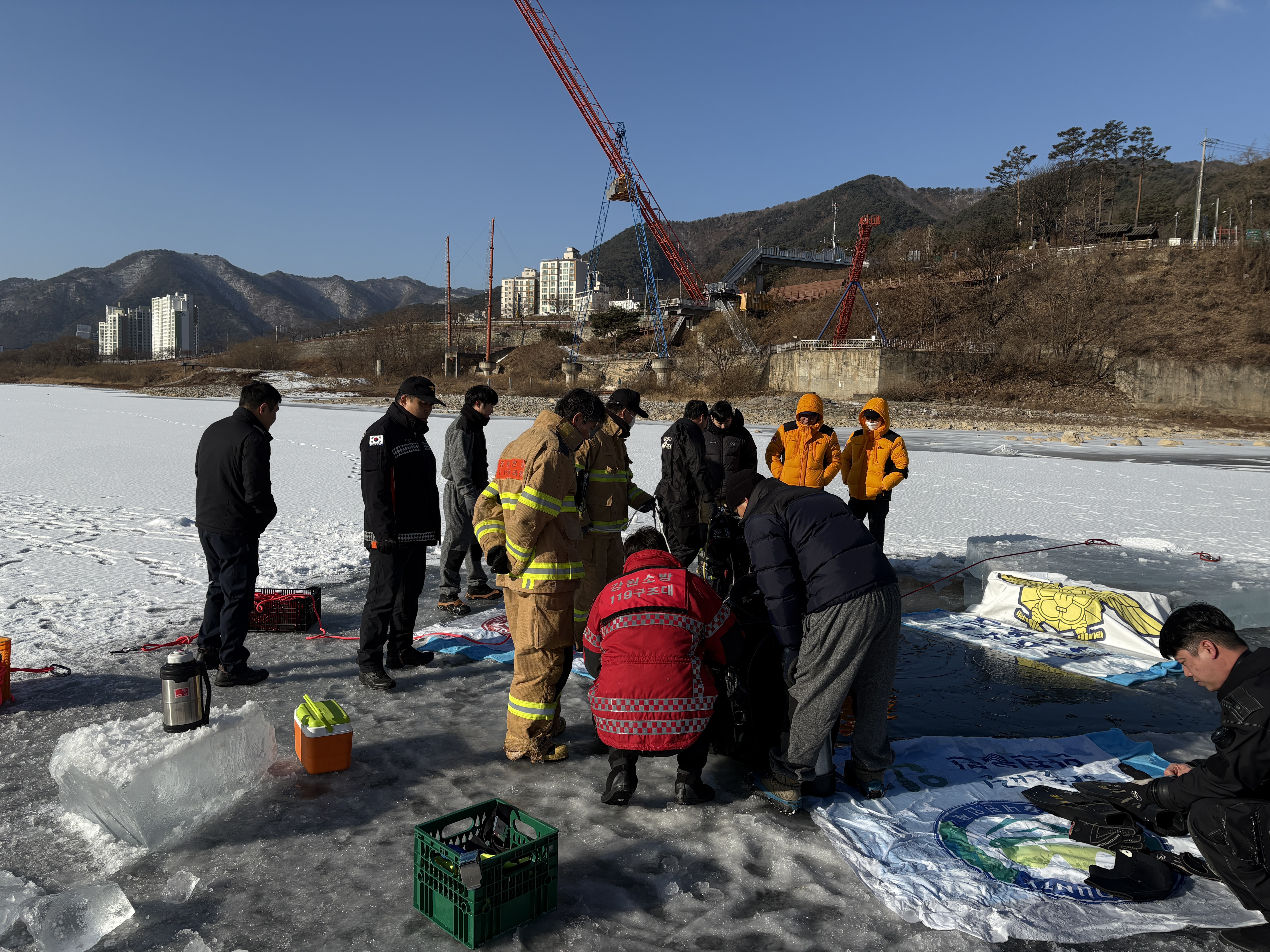 인제소방서는 금일 인제읍 덕산리 합강교 밑 하천에서 인제군 민간수중구조대와 함께 동계 수난사고 대비 합동훈련을 실시하였습니다.