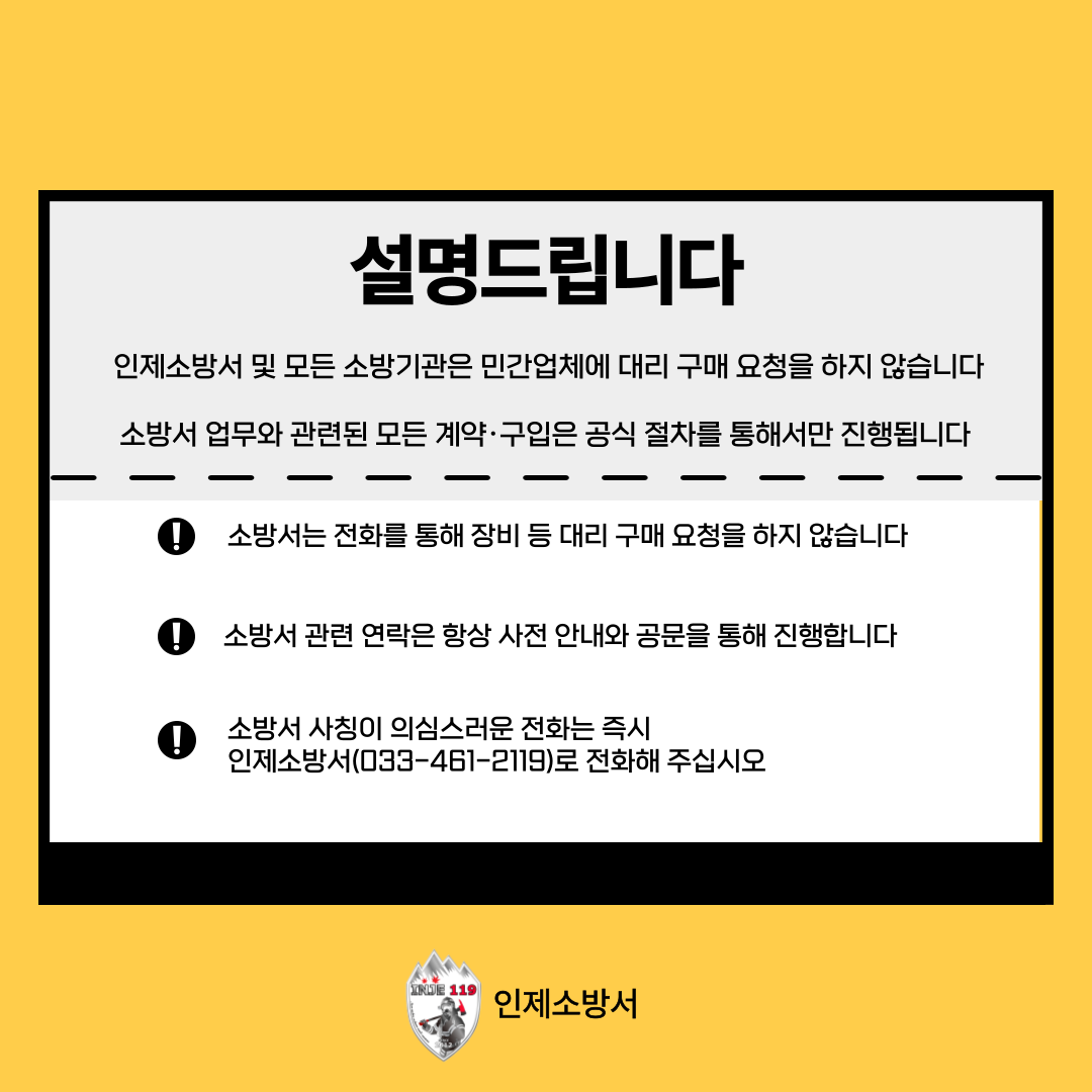 인제소방서에서 알려드립니다. 최근 전국적으로 소방기관을 사칭하여 물품대납을 유도하는 사기행위가 급증하고 있어 피해 방지를 위해 유의사항 및 대응방법을 알려드립니다.