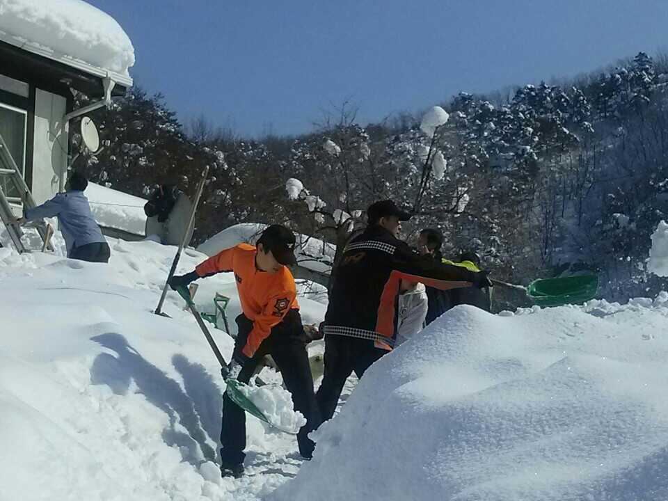 2014년 2월 15일 인제소방서(서장:김용락) 공무원과 의용소방대 60여명이 폭설로 뒤덮인 고성군 간성읍 탑동마을에서 제설․ 복구작업을 하고 있다.