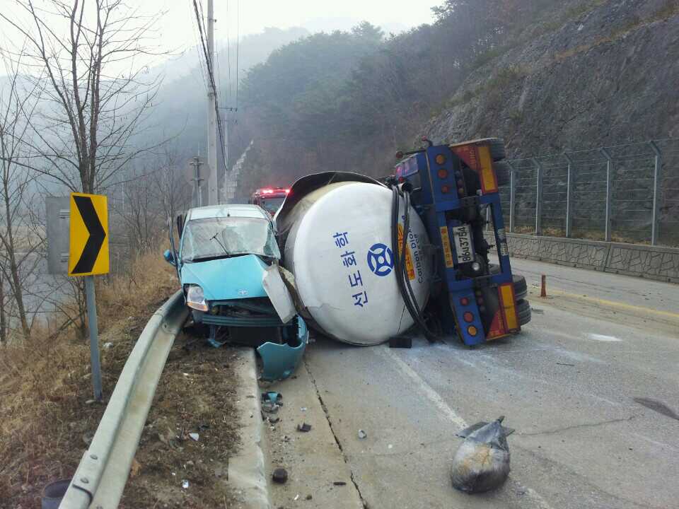 3.17일 오전 8시25분경 북면 월학리 453호 지방도에서 40t 탱크로리가 도로 옆으로 넘어지면서 마주오던 마티즈 승용차 충돌, 중상자 3명 발생