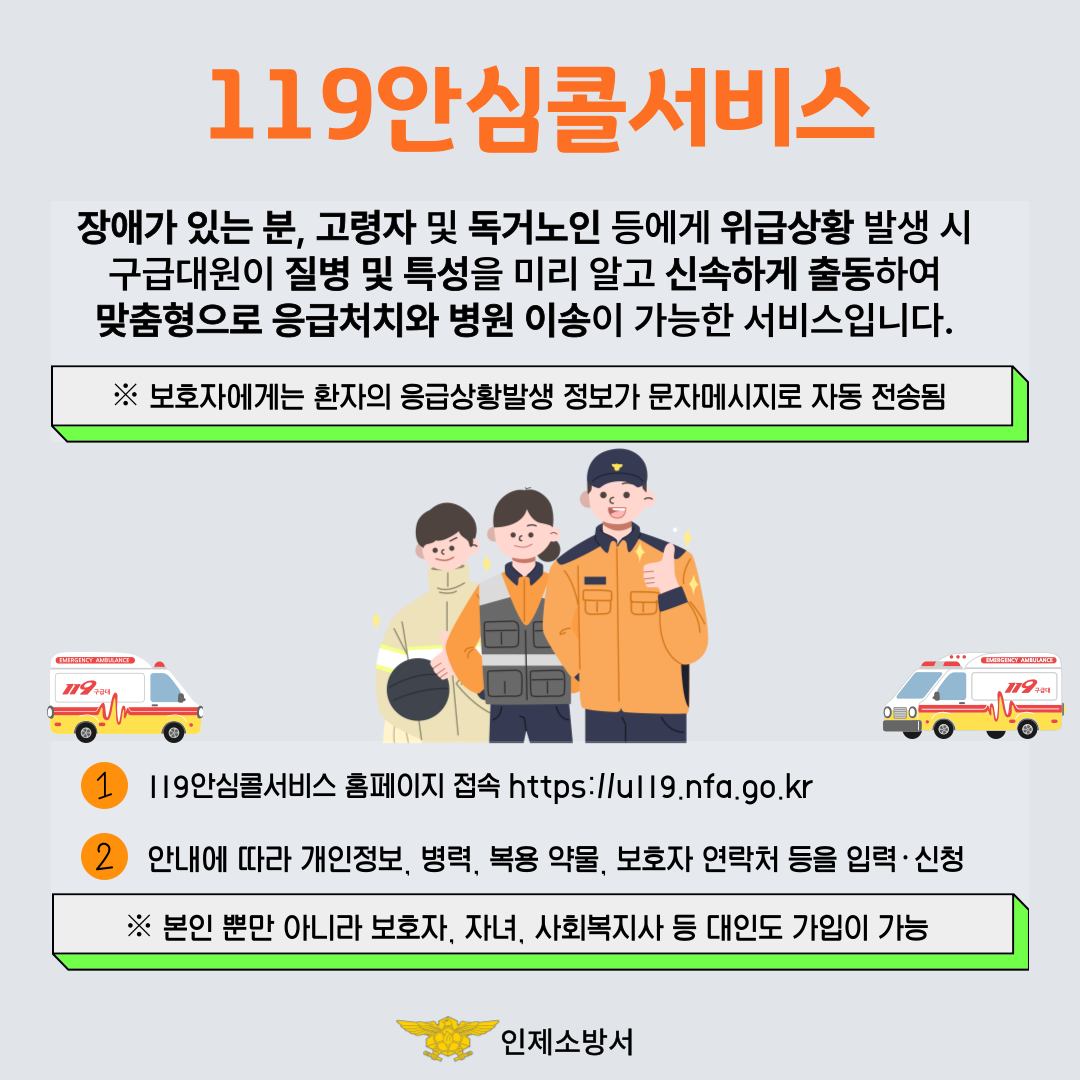 인제소방서(서장 정만수)는 사전 등록된 군민의 정보를 바탕으로 맞춤형 119구급서비스를 제공하는 ‘119안심콜 서비스’를 홍보한다고 26일 밝혔다.