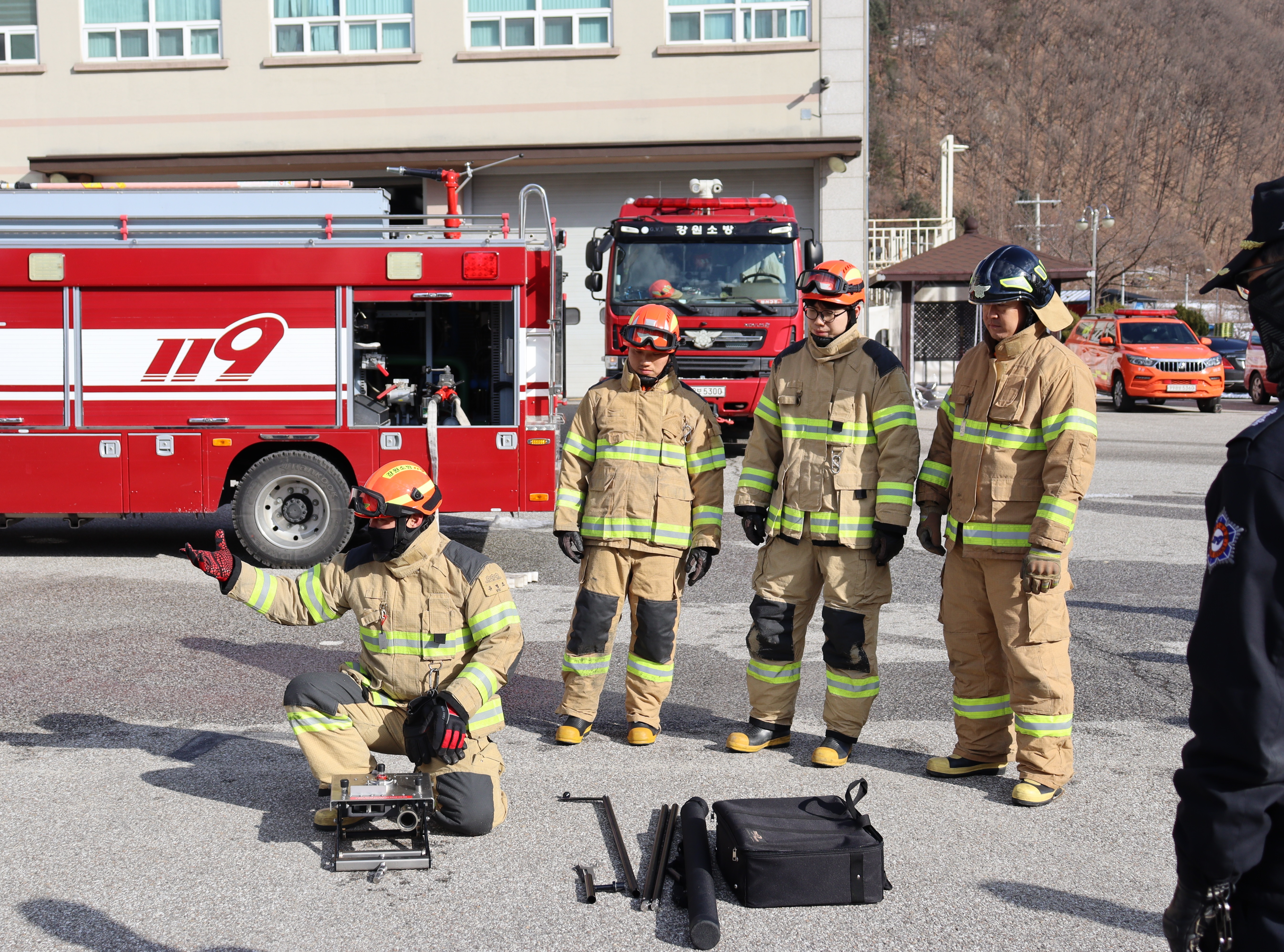 ➤ 정선소방서(서장 유영민)는 지난 7일 오후 2시 소방서 차고 앞에서 전기차 화재진압장비인 ‘EV-드릴랜스’를 활용한 특별 훈련을 실시했다고 밝혔다.