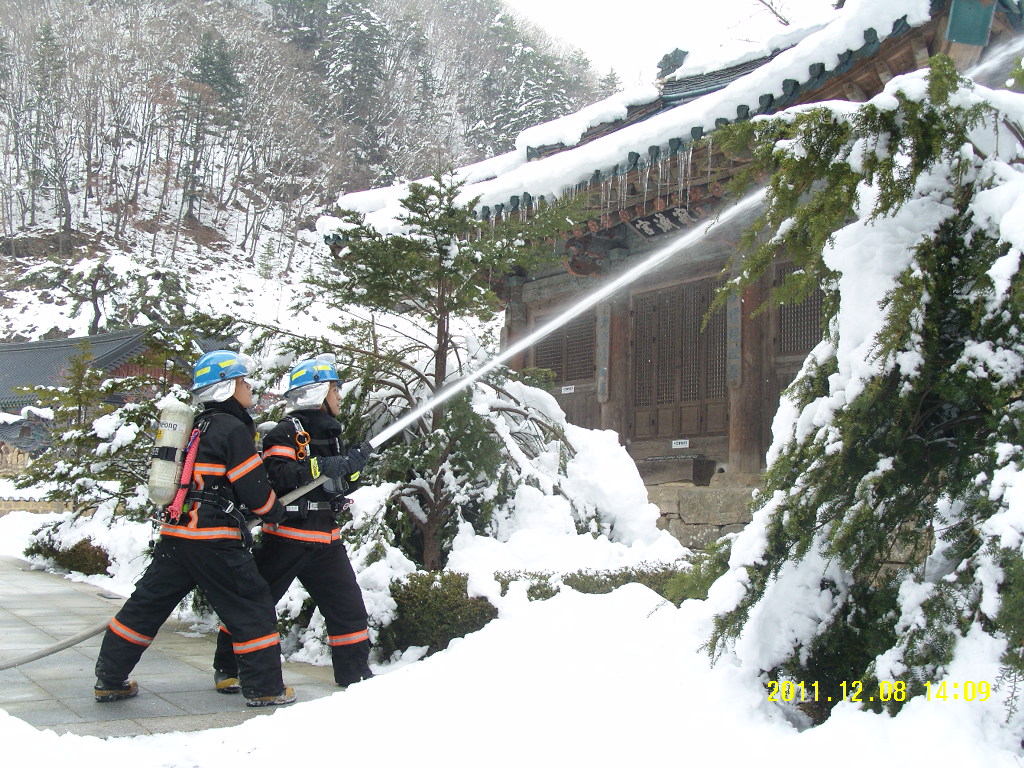 정선소방서(서장 박창진)는 2011년 12월 8일 정암사에 대한 합동 소방훈련을 실시 하였습니다. 정암사는 강원도 지정 문화재 자료 32호로써 부처님의 진신사리를 모시고 있는 사찰입니다. 이번훈련은 사찰내 비상소화전 함 및 co2소화설비를 이용한 자체 진화, 문화재의 수손 방지 및 목구조의 진압요령, 광역응원출동훈련을 병행하여 실시 하였습니다.