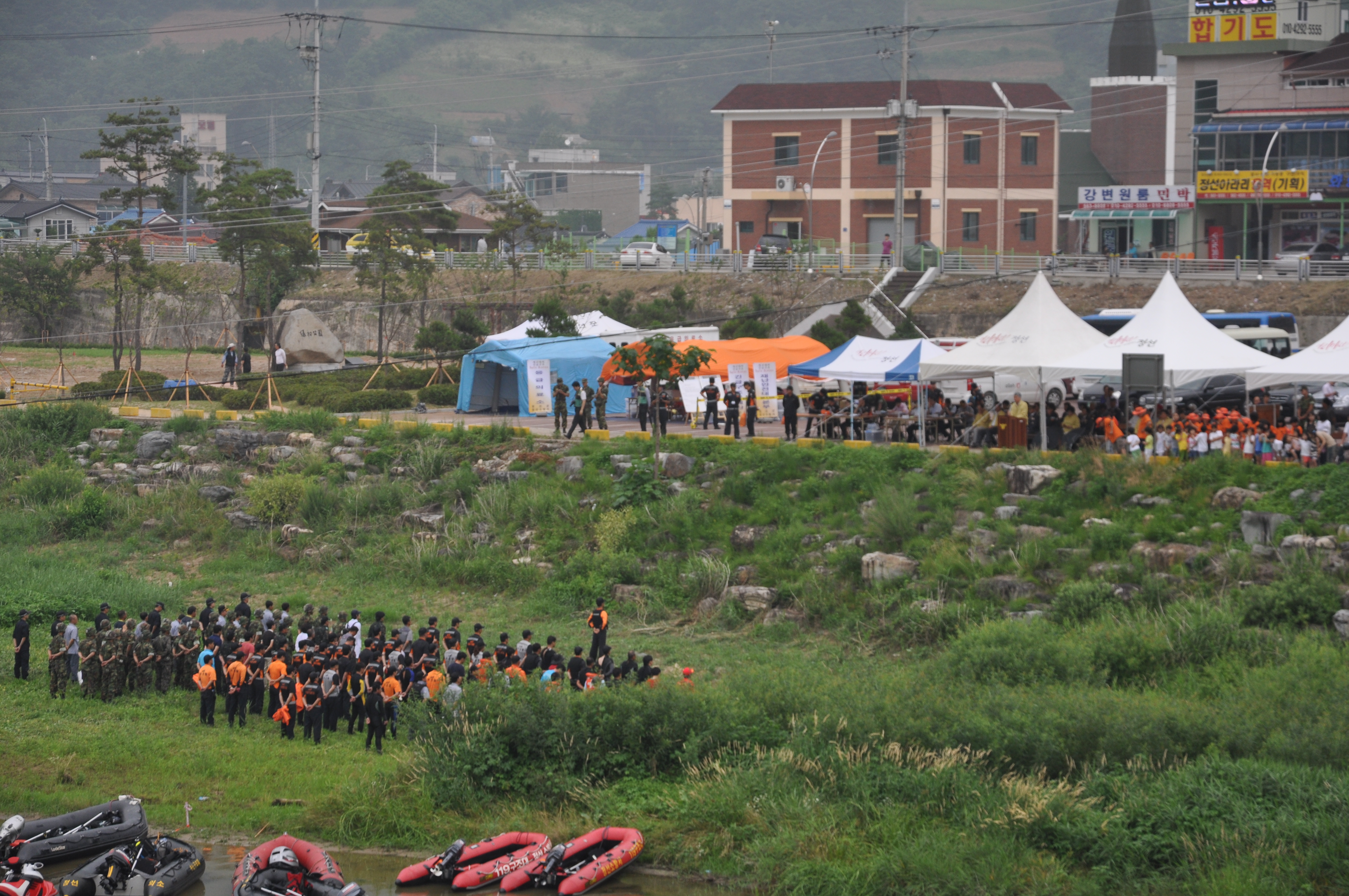 정선소방서(서장 이병광)는 5일 14시 정선읍 소재 녹송공원 앞 조양강변에서 산사태에 의한 매몰,수난,오염 등 복합사고 대비 2012년 재난대비 긴급구조종합훈련을 실시했다.