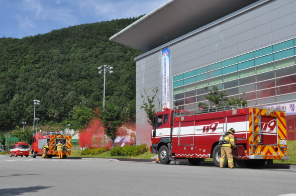 ▶ 훈련은 정선종합경기장 실내체육관내 정선 군민 200여명을 인질로 수십억원의 금품을 요구 테러범과 대치하는 과정에서 건물붕괴 및 화재가 발생하는 상황을 가정하여 정선소방서에서는 인명구조 및 화재진압 훈련을 실시했다.