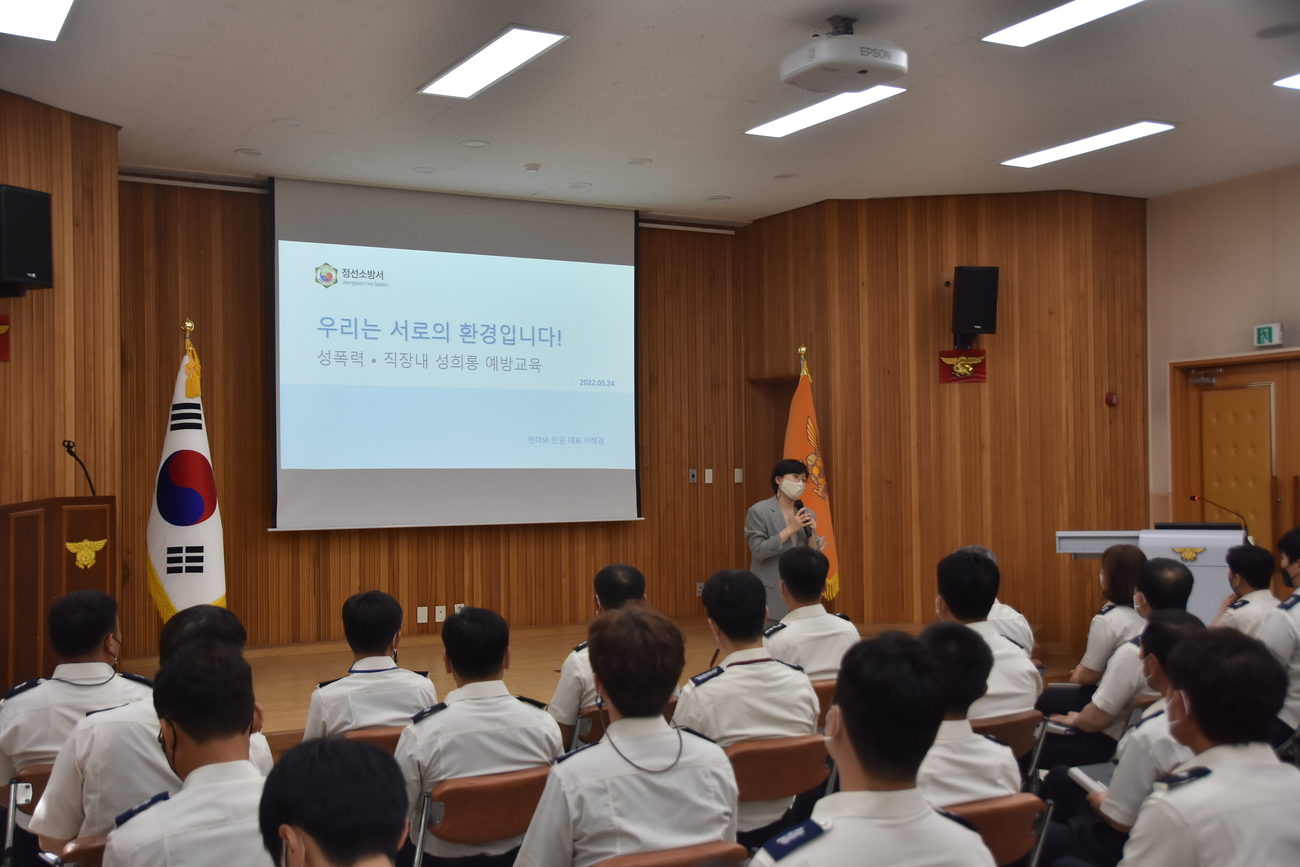 ➤이날 직장교육훈련은 제8회 전국동시지방선거를 앞두고 소방공무원이 지켜야하는 선거 중립 준수 특별교육과 음주운전근절 및 안전사고예방 특별교육을 서장이 진행하였다. 그 후 외부강사의 성희롱·성폭력 예방교육 순으로 진행하였다.
