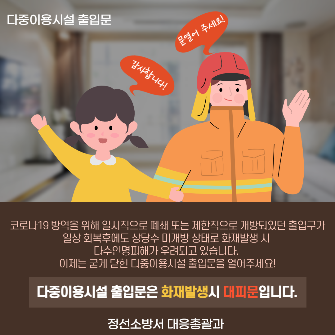 ➤소방서 관계자는 “출입구는 재난생활 발생 시 유일한 비상구가 될 수 있기에 인명피해를 막기위해 열어달라”고 전했다.