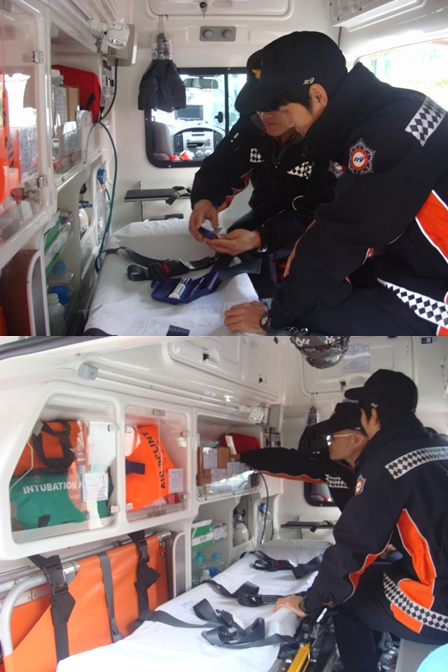 정선소방서 신동119안전센터 3팀은 금일 구급차내 의료장비 사용법 숙달훈련을 실시하였습니다