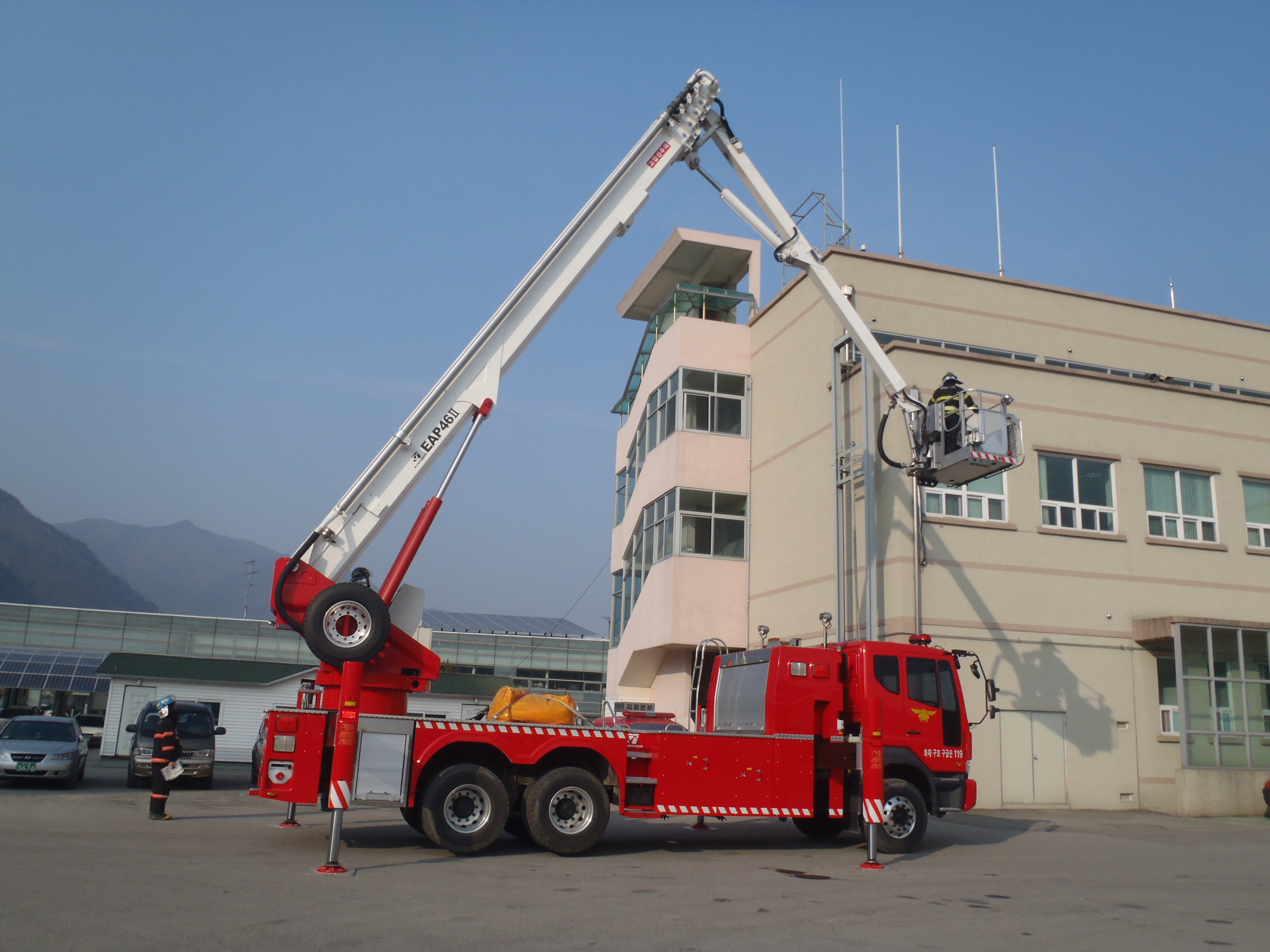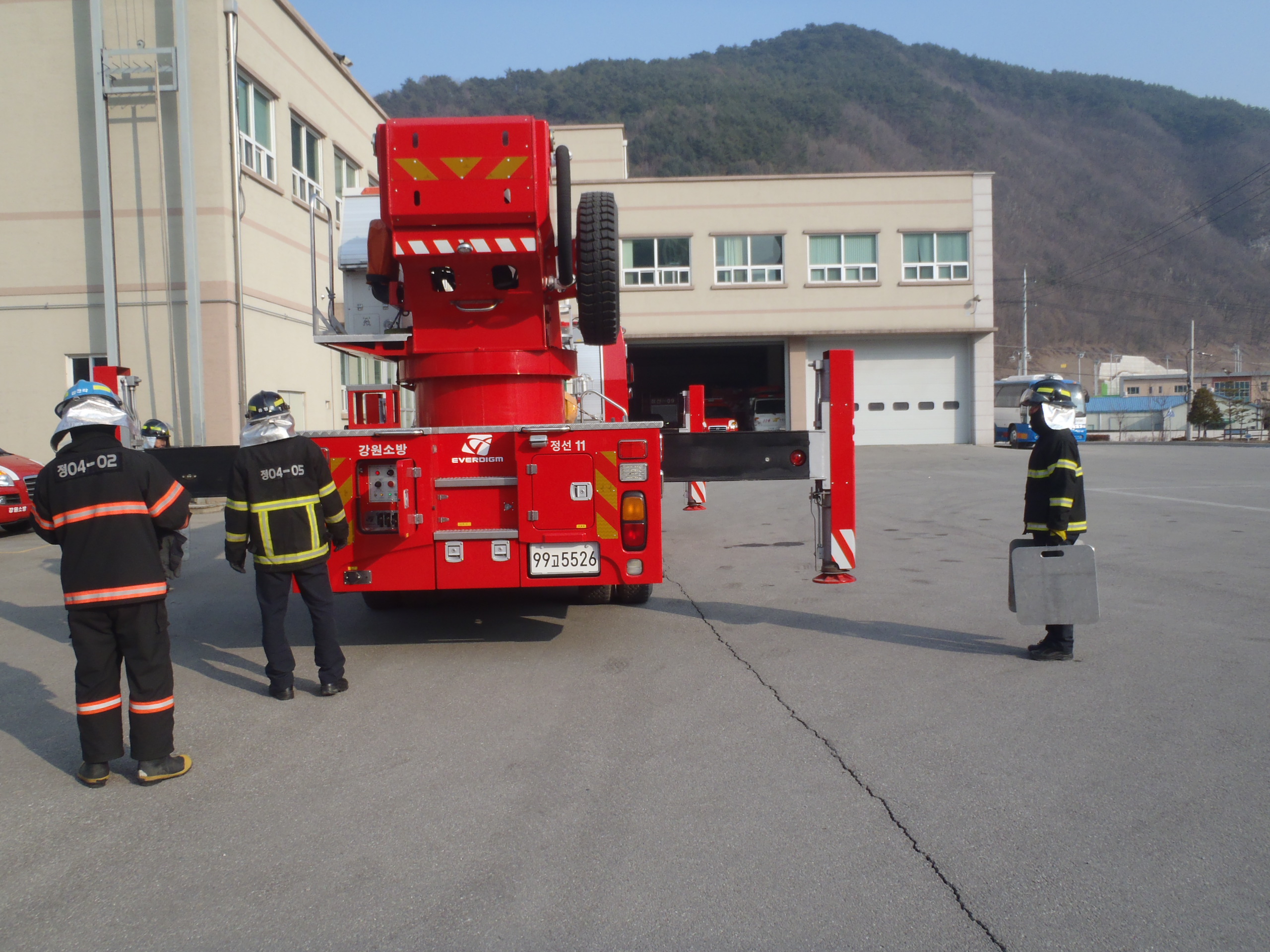 정선소방서(서장 박창진) 정선119안전센터는 2012년 1월9일 추운 날씨에도 굴절사다리차를 이용한 현장활동 표준기법를 실시하였습니다^^