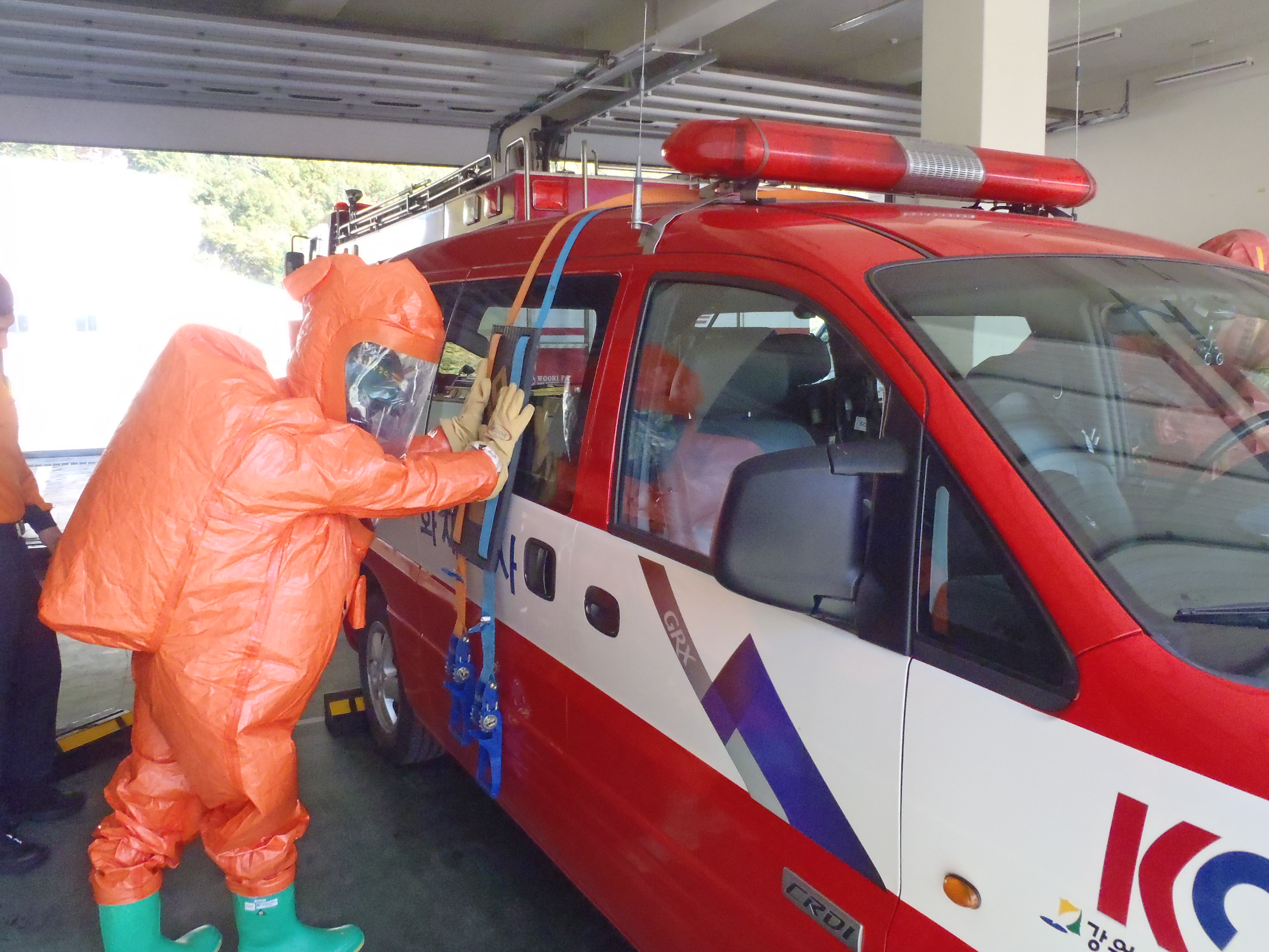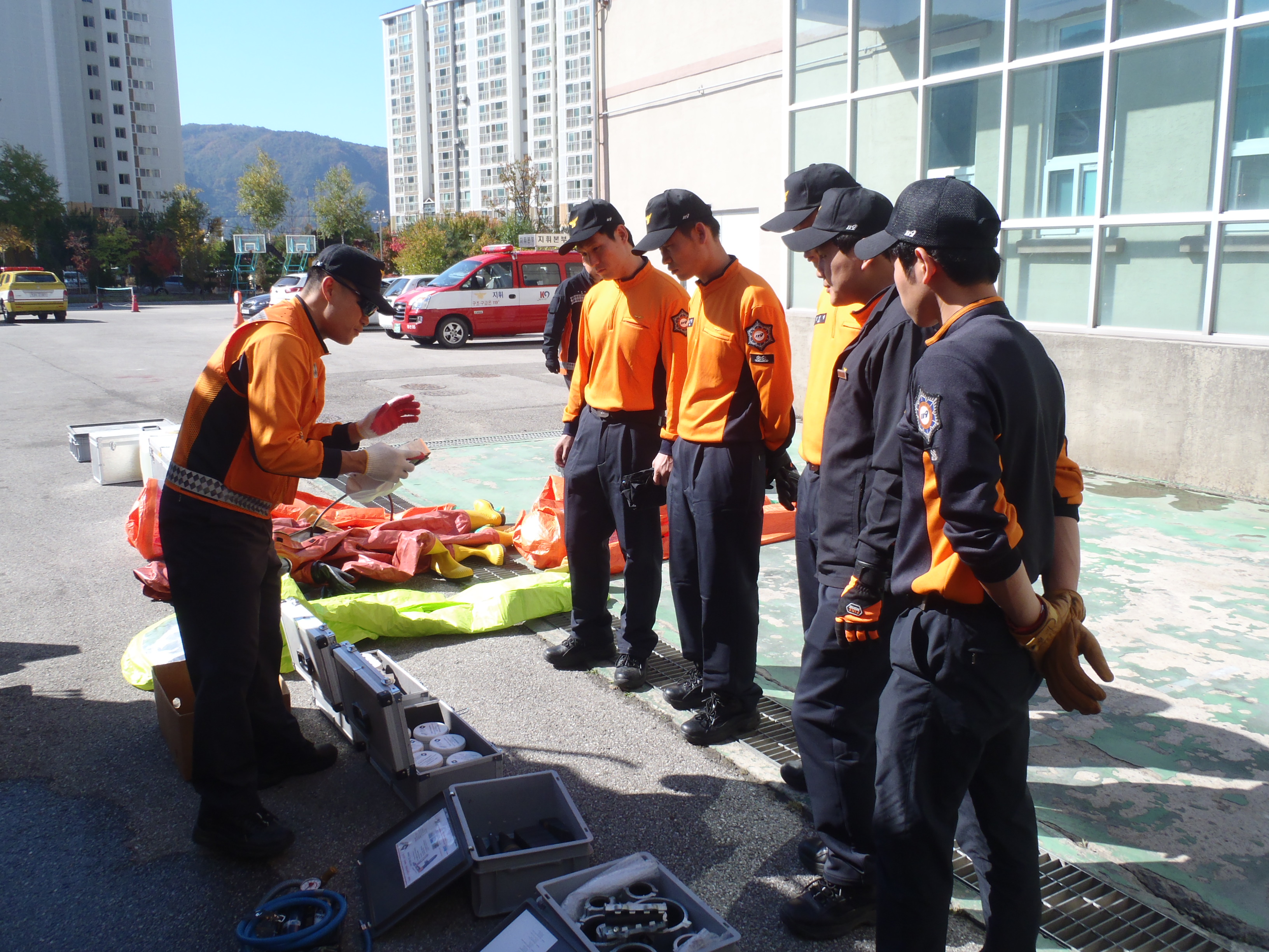 정선소방서(서장 이병광)방호구조과 구조진압대에서는 금일 대형사고 및 화학테러 대비 현장대응 능력을 향상시키기 위한 화학구조 훈련을 실시하였습니다. 신규임용자 및 구조진압대 대원들은 화학복 착용법을 익히고 유해물질 누출사고시 대응방법에 대하여 몸으로 직접 익힐 수 있었던 유익한 시간이었습니다.