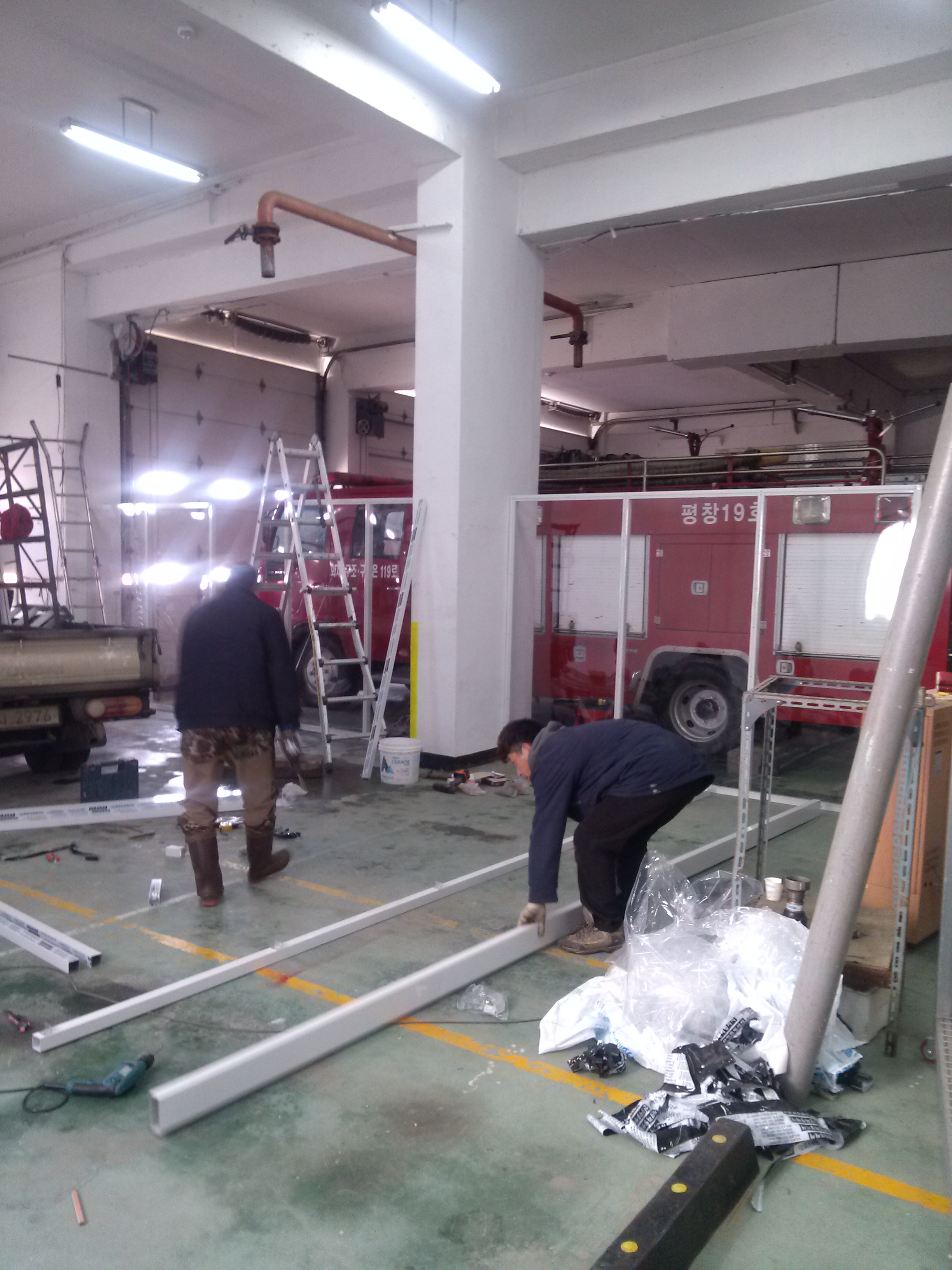 진부센터 소방차량차고 열손실방지 간이칸막이 설치중 사진입니다.