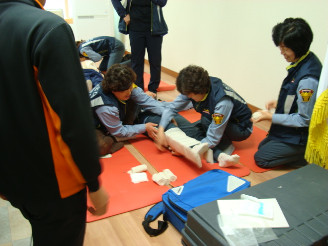 출석한 대원들은 모두 심폐소생술과 부목고정 훈련을 하였는데 심폐소생술은 몇차례