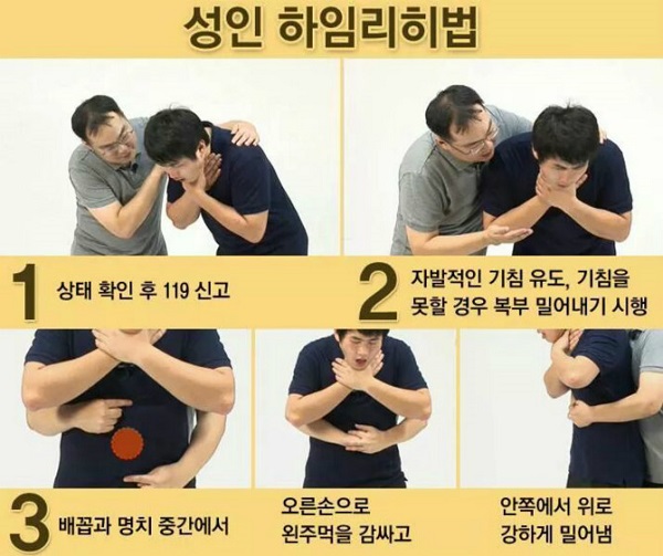 첫 번째는 음식물로 인한 기도폐쇄다. 이러한 경우 환자 상태 확인 후 119에 신고하고, 기침을 유도해야한다. 환자가 기침을 자발적으로 할 수 없다면 ‘하임리히법’으로 응급처치를 시행해야 한다.