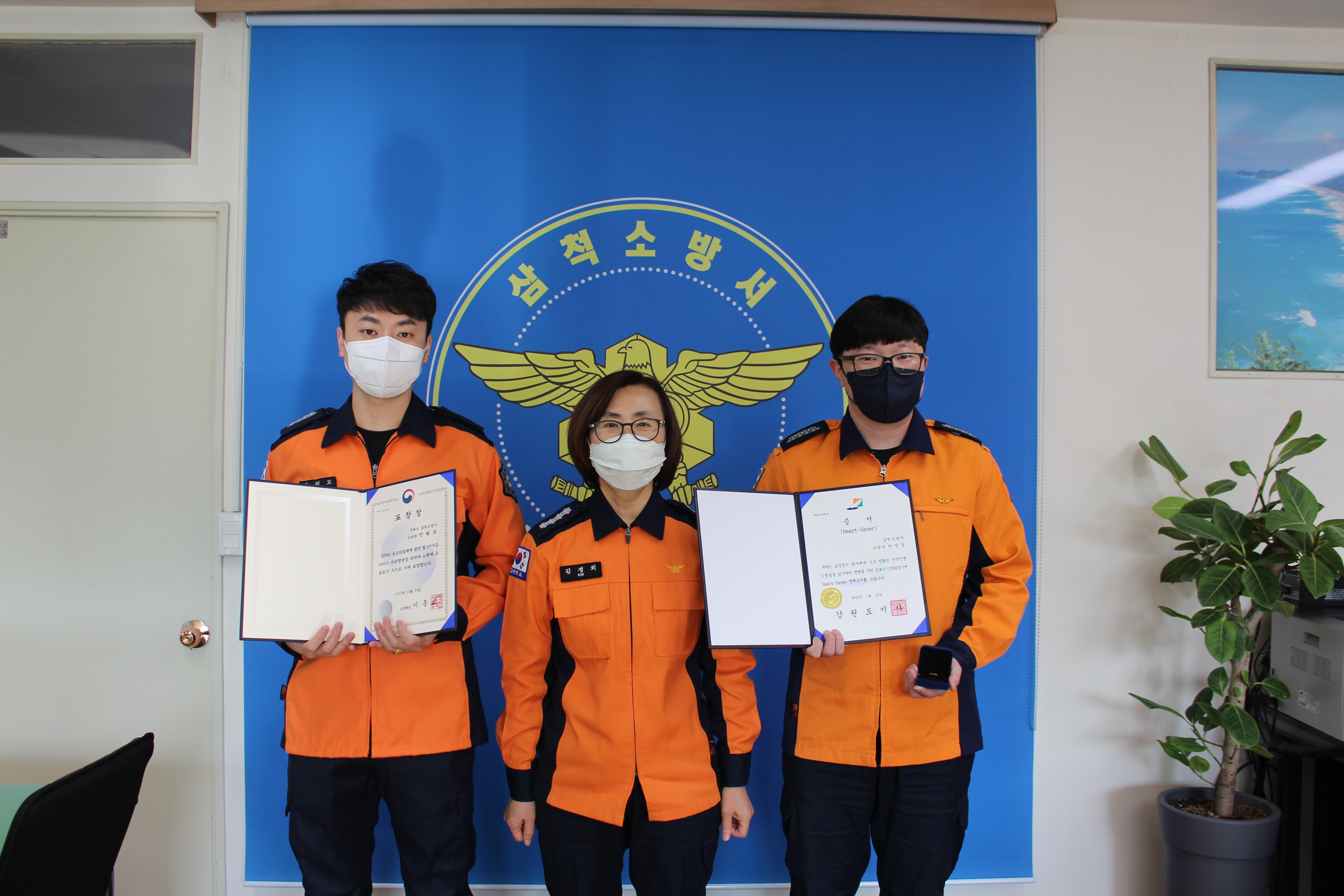 삼척소방서(서장 김정희)는 10일 오전 10시 30분 삼척소방서에서 소중한 생명을 구한 구급대원에게 하트세이버 인증서와 배지를 수여했다.
