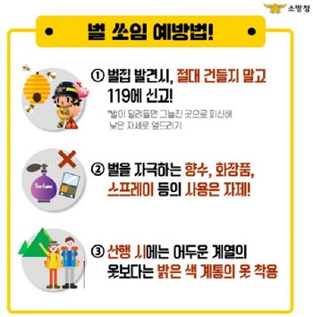 벌 쏘임 예방법은 ▲야외 활동 시 벌을 자극하는 향수, 화장품, 스프레이 등 자제 ▲흰색 계열의 옷 착용(어두운색 계열의 옷에 공격성을 보임) ▲(벌집 발견 시) 자세를 낮춰 천천히 다른 장소로 이동 ▲(벌집 접촉 시) 머리부위를 감싸고 신속하게 20m이상 이탈 등이다.