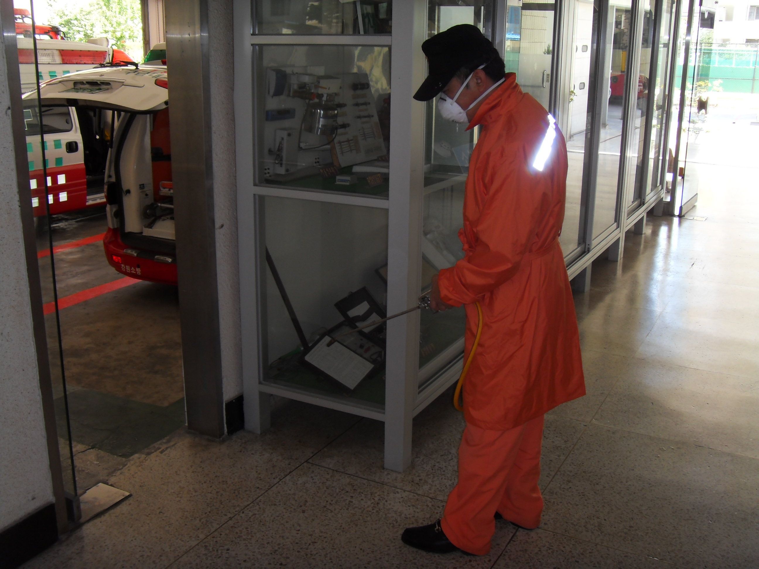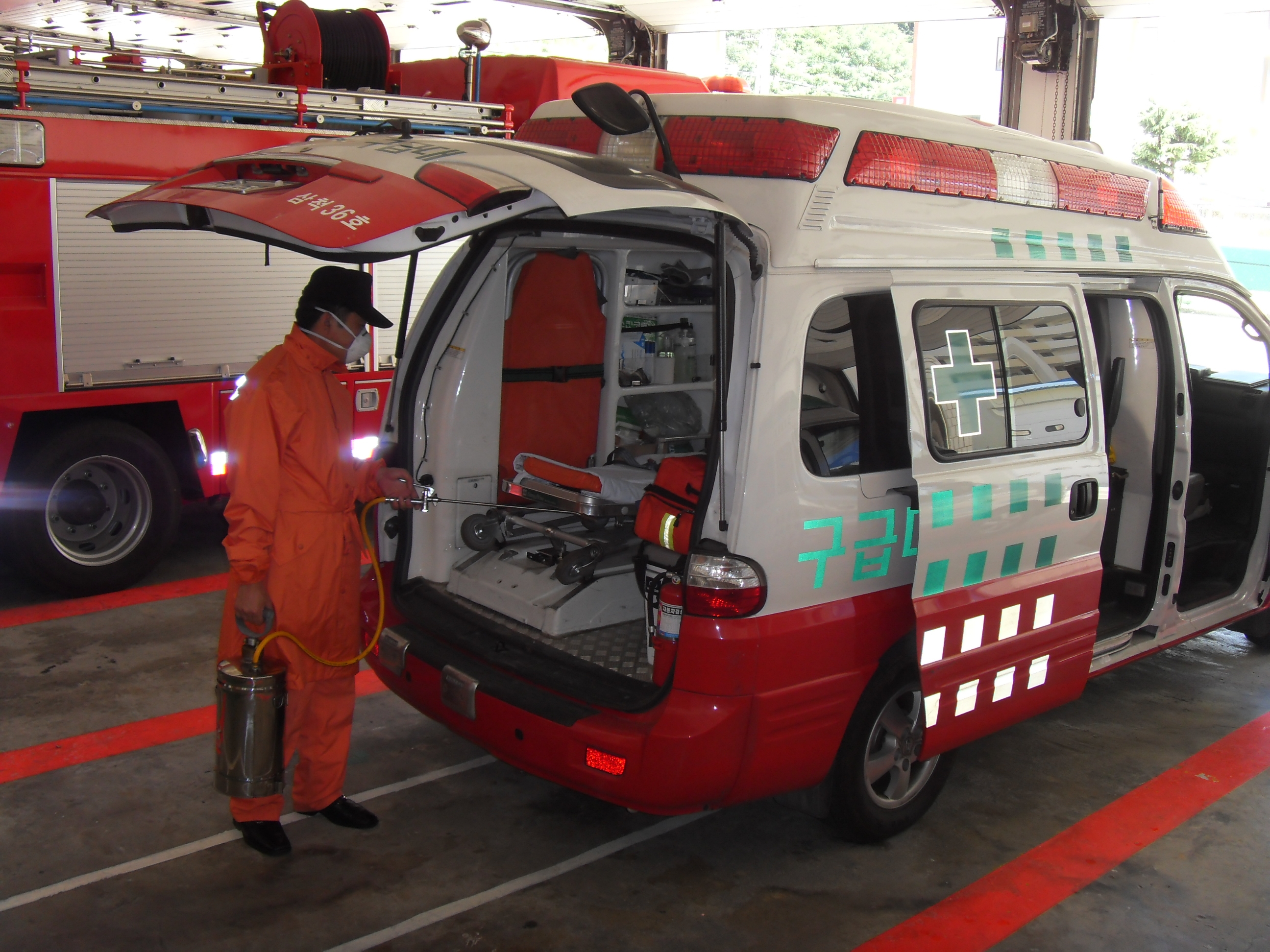 삼척소방서 - 신종인플루엔자 예방을 위해 소방차량 및 청사 일대에 대한 소독 실시