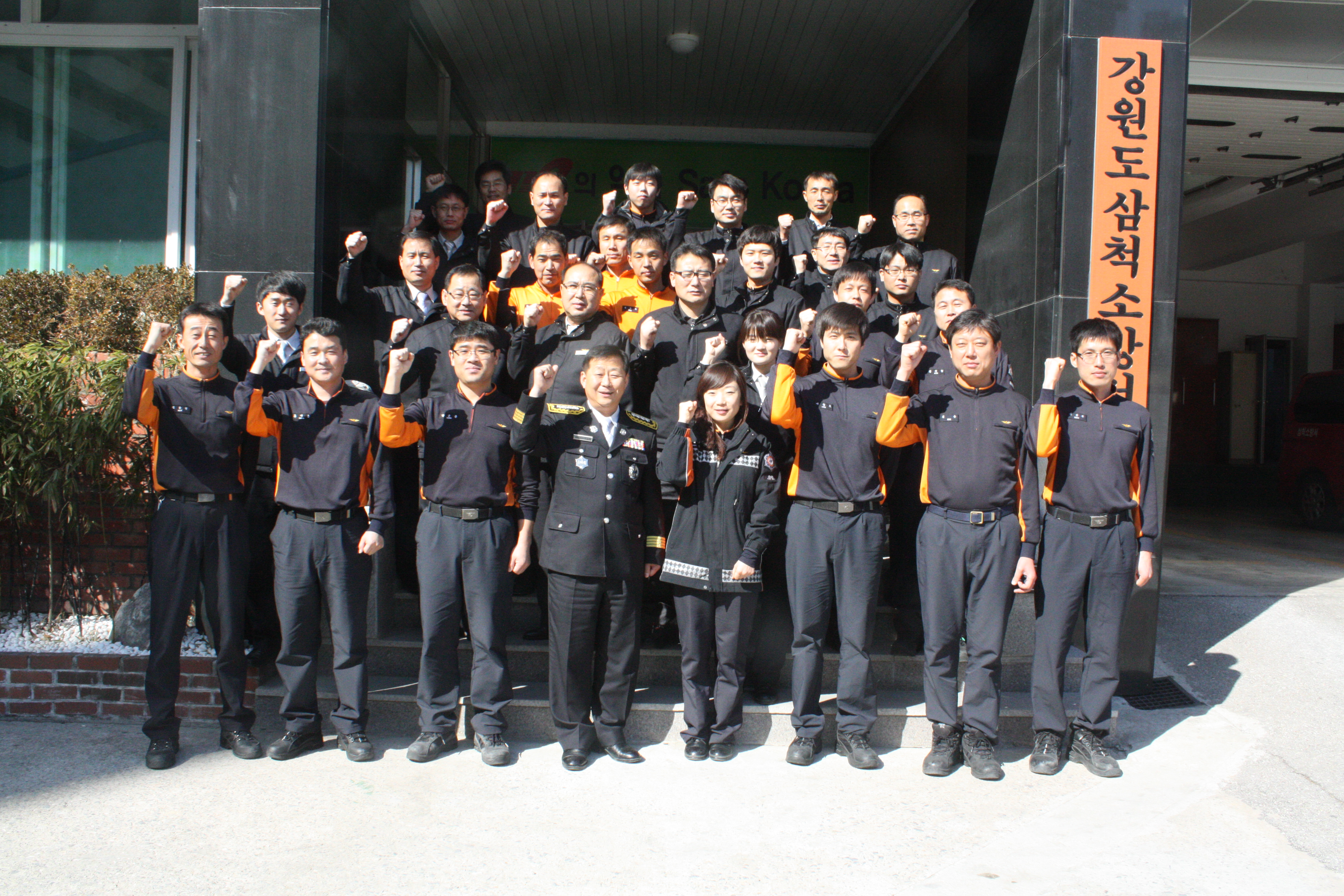 삼척소방서 직원들은 20일 청사앞에서 3.1절 건강달리기 대회 완주를 다짐하며 기념촬영을 하였다.