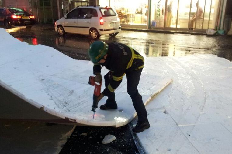 2012. 8. 30 18:47분 태풍의 영향으로 충일장 모텔 외벽 엘리베이터 보호막 설치한 드라이비트가 강풍에 떨어진 상황으로 현장대응과 직원들이 현장출동하여 위헙배제 안전조치 완료함