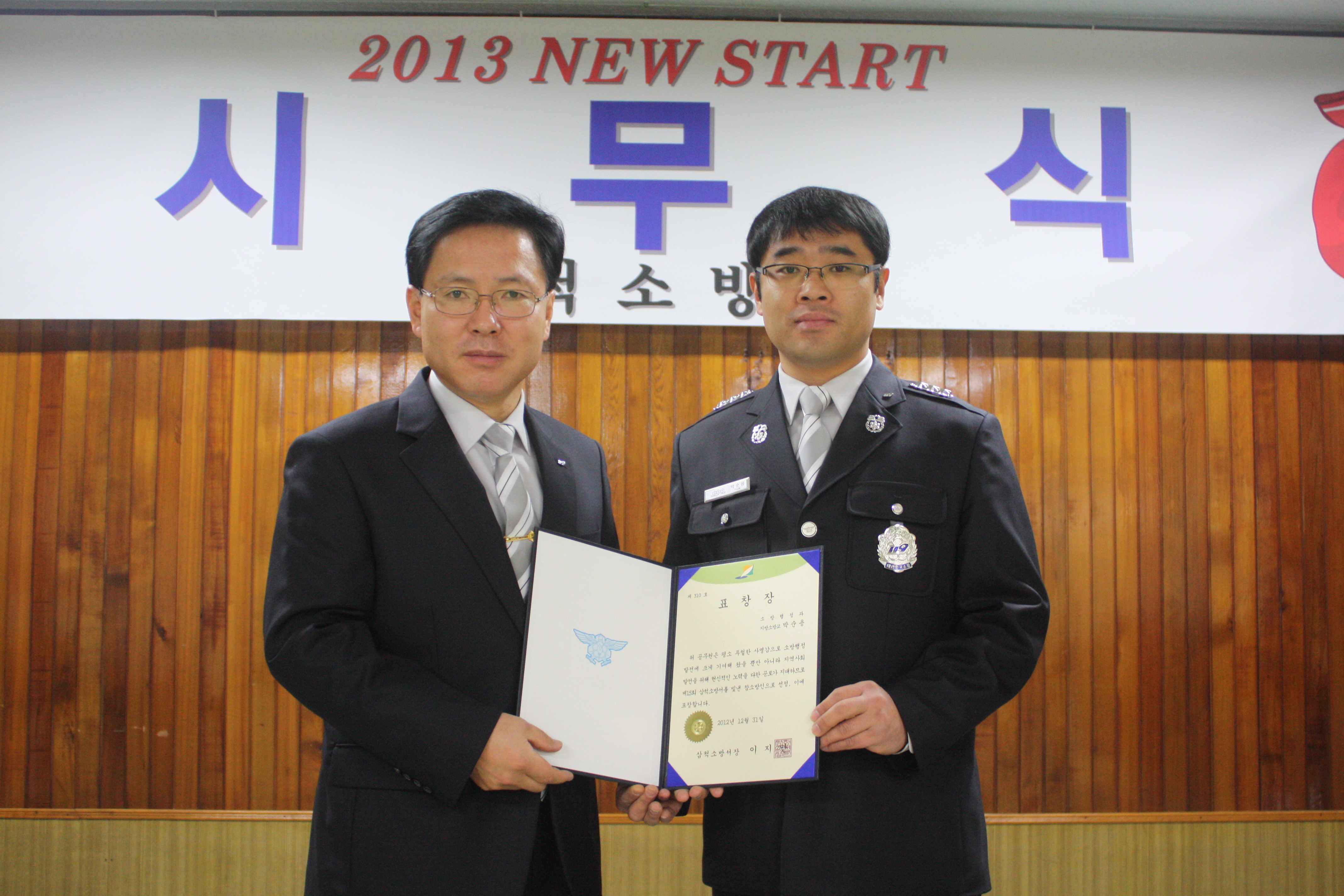 △ 삼척소방서(이지만 서장)는 2013년 1월 2일 2012년도 4분기 ‘참소방인’으로 소방행정과 소방교 박순용을 직원들의 자율적인 투표로 선정 시상하였다.