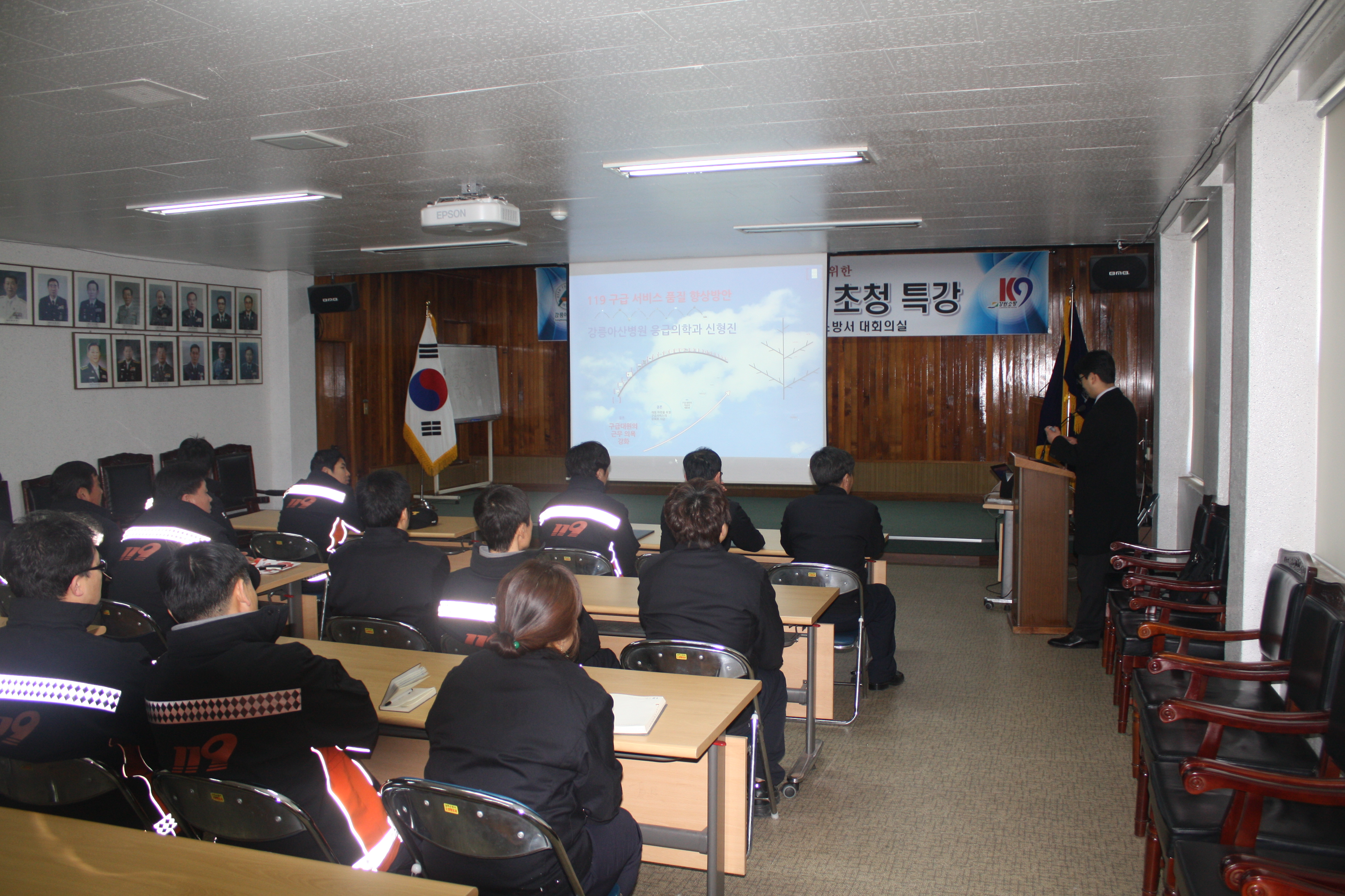 2013년 2월 21일 10시부터 대회의실에서 구급대원 25명을 대상으로 신형진(39세)구급지도의사를 모시고“구급서비스 품질관리”특별교육을 실시했다.