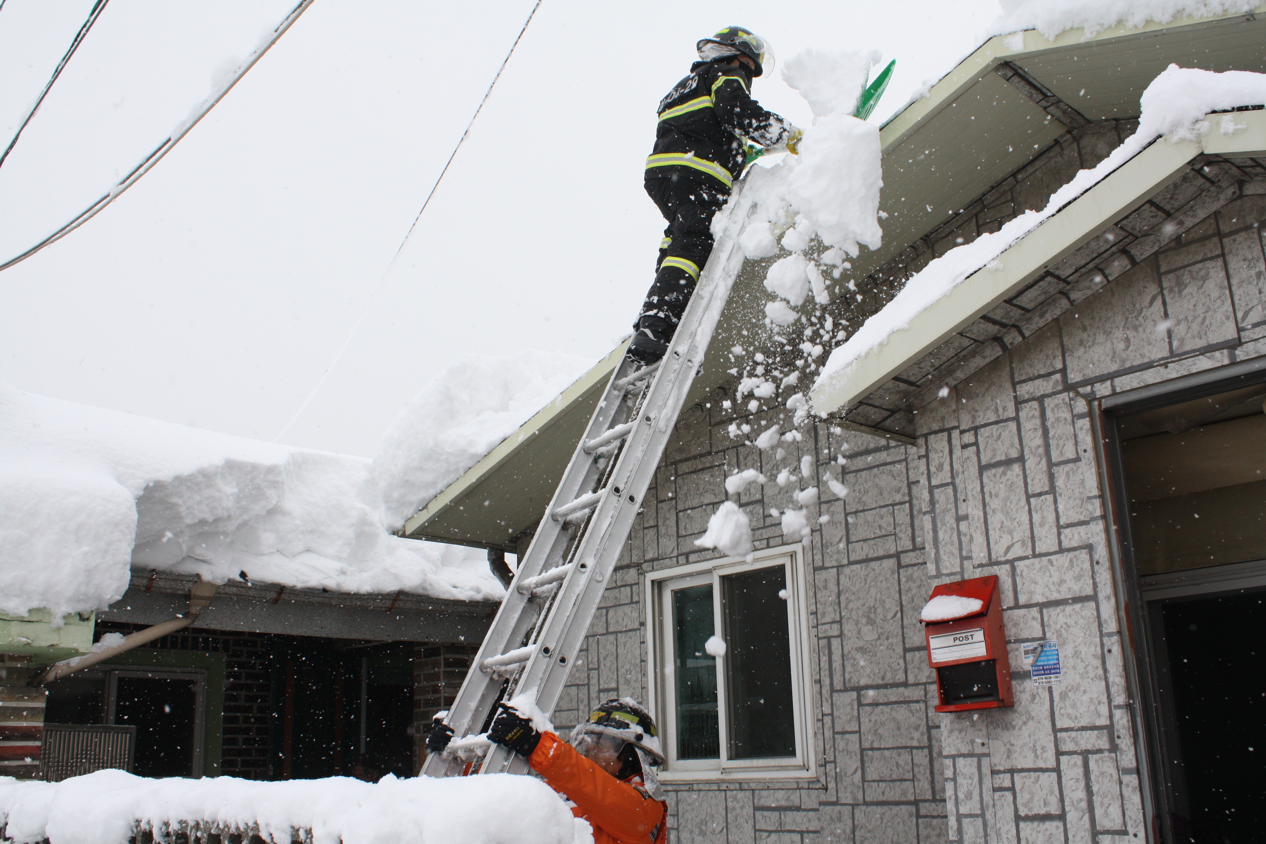 차량, 대문, 지붕 및 옥상 위 붕괴를 방지하기 위해 눈을 치울 경우 직접 올라가지 말고 사다리