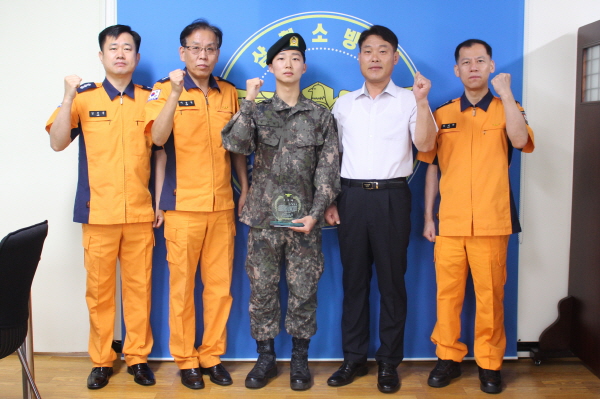 이날 전역한 엄기현 수방은 지난 2016년 11월 24일 소방서로 배치되어 23개월 동안 군 대체복무제도인 의무소방원으로 근무하며 화재ㆍ구조ㆍ구급 등 재난현장에서 보조요원으로 성실하게 의무를 다해 지역주민의 안전을 지켜왔다.