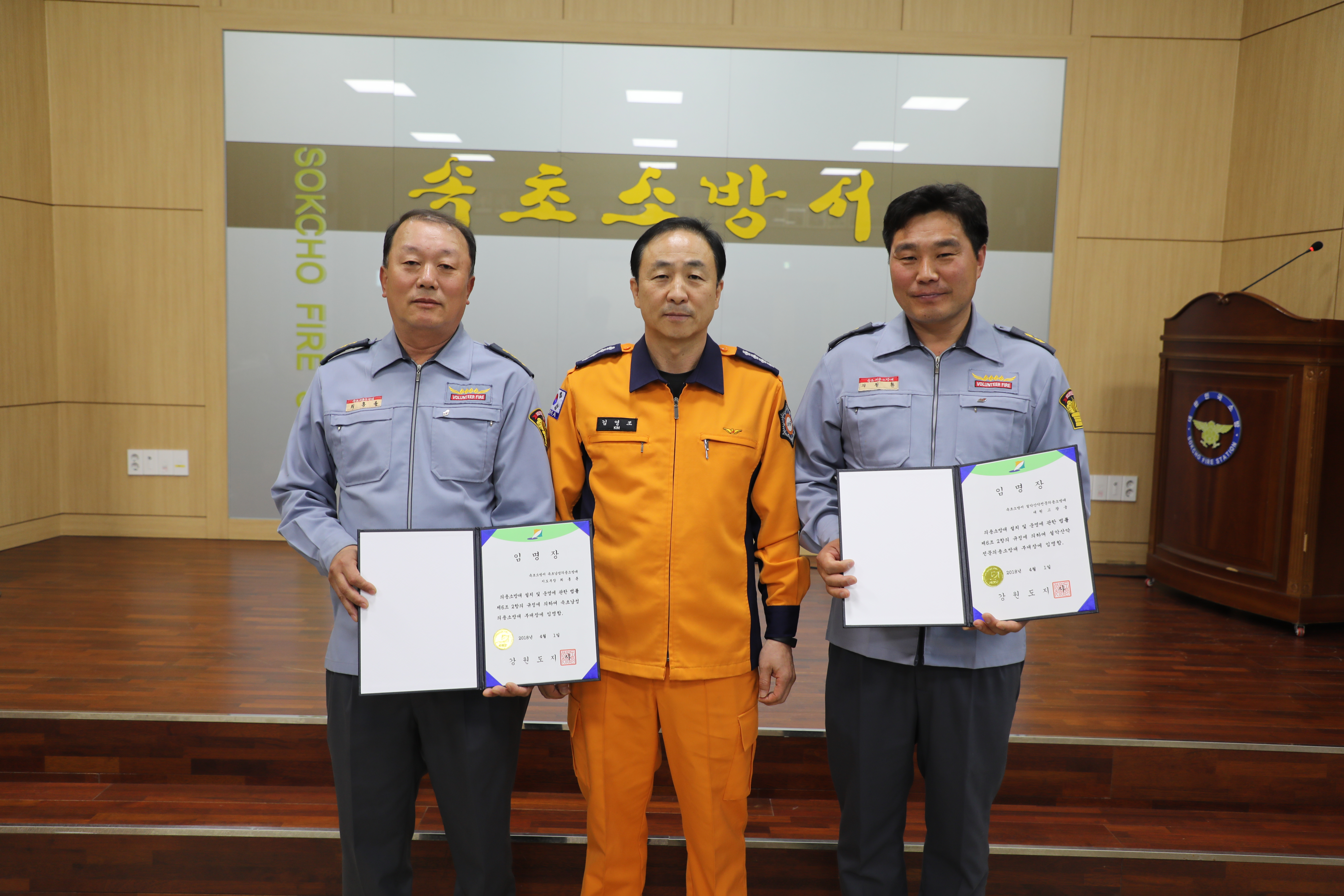 속초소방서(서장 김영조)는 16일 오전 10시 30분 3층 대회의실에서 소방공무원과 의용소방대원 60여 명이 참석한 가운데 속초 남성 의용소방대 최홍륜 부대장과 설악산악전문대 고광웅 부대장에 대한 임명장 전수식을 실시했다.