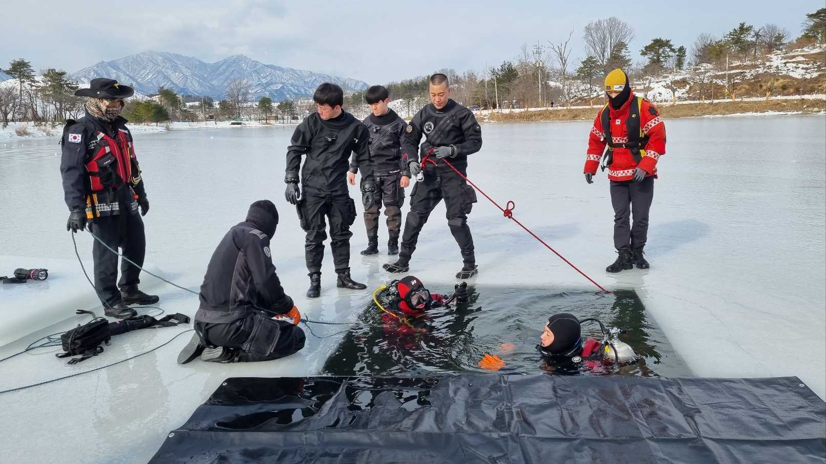 훈련 내용으로는 ▲빙상사고 대비 인명구조훈련 ▲ 2인1조 수중 수색구조법 훈련 ▲ 각종 상황에 맞는 요구조자 안전확보훈련 등 이다.