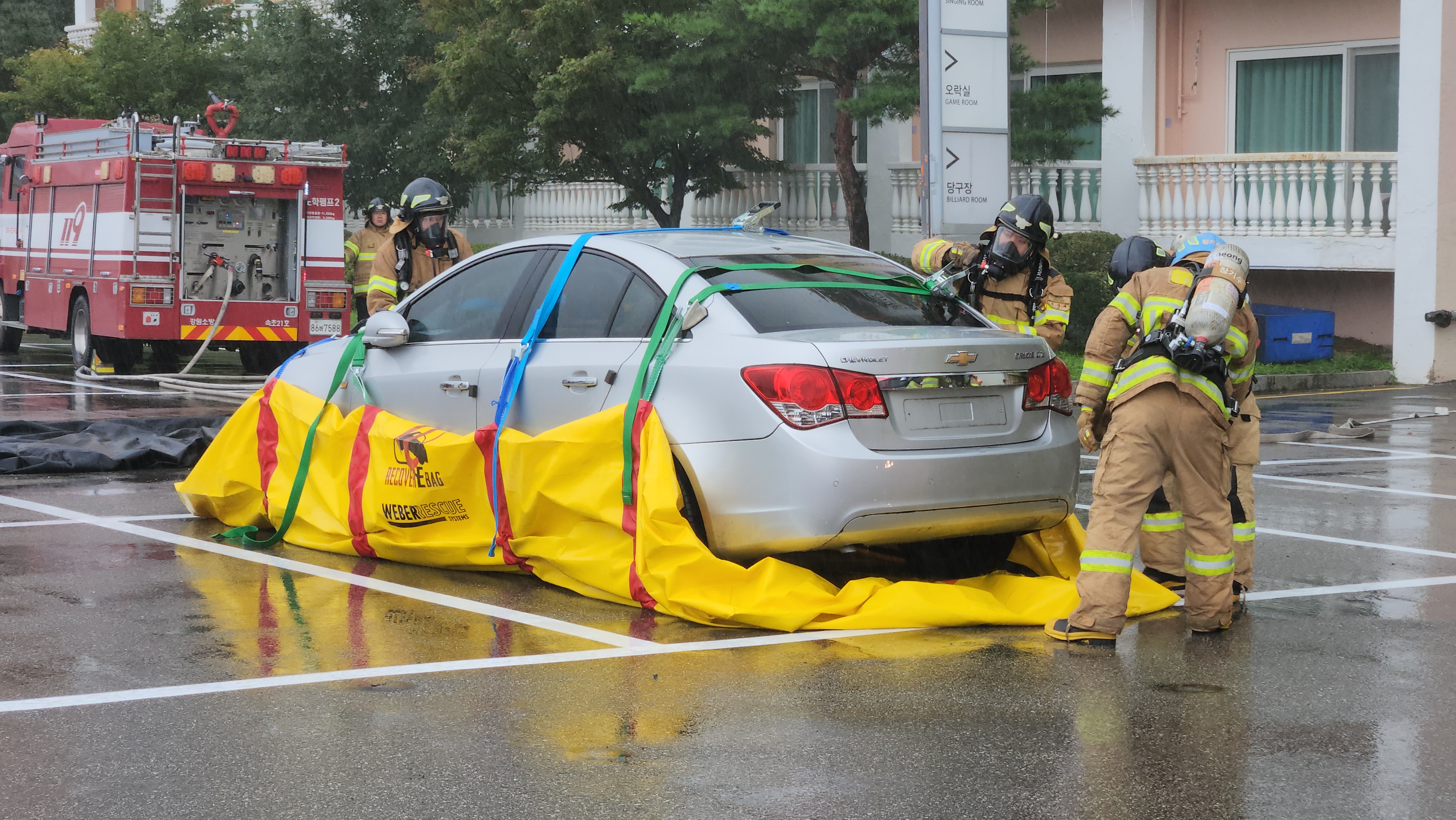 특히 이번 훈련에는 최근 대두된 전기차 화재와 관련하여 질식소화덮개를 이용한 화재진압, 드론을 이용한 재난현장 검색 및 요구조자 파악 등을 선보였다.