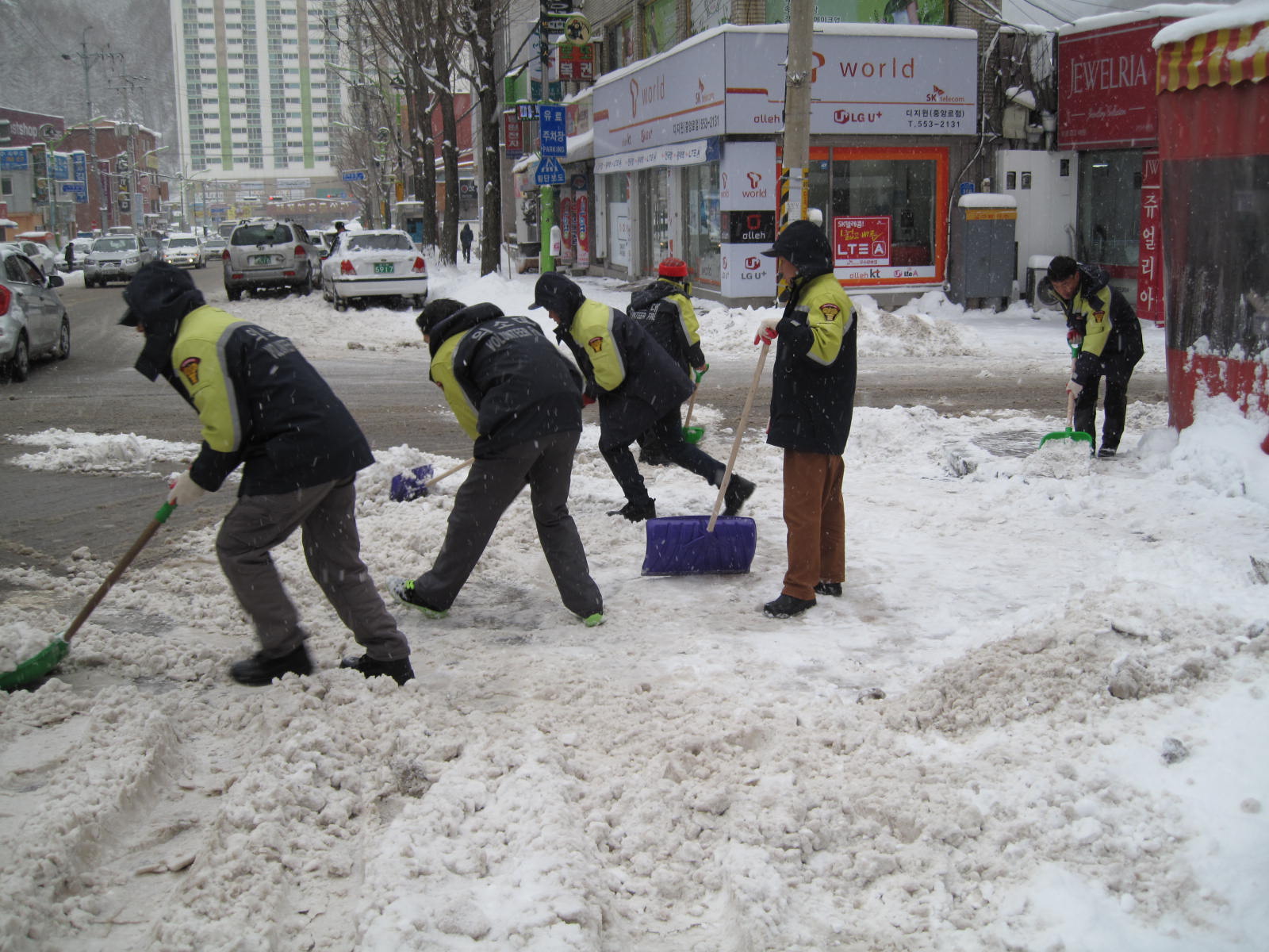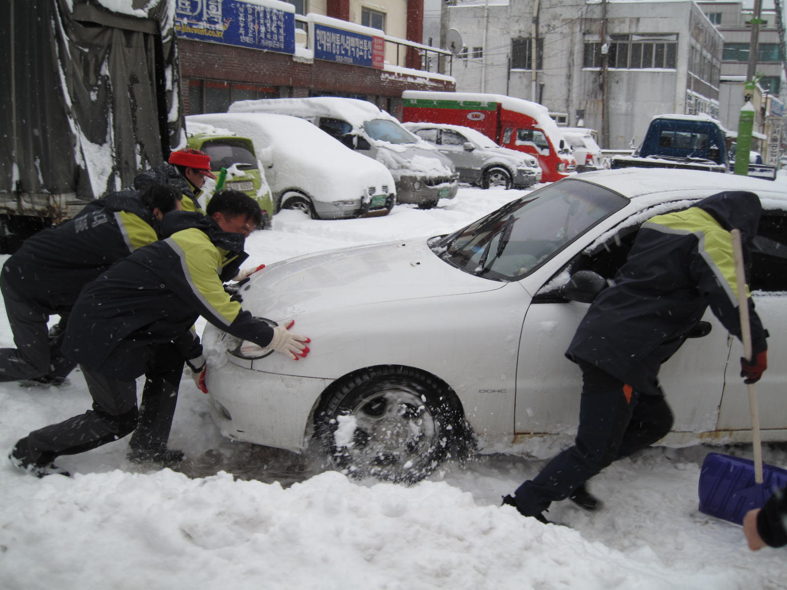 시민들로 부터 큰 호응를 얻었고 눈길에 빠저있는 차량도 힘을 합하여 밀어주었다