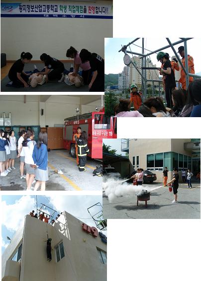 태백소방서(서장 정승진)은 7일,8일 2일간 황지정보산업고등학교 3학년 학생 10에게 직업체험학습을 실시하였습니다. 첫째날엔 부서별 업무를 체험하였고, 둘째날엔 심폐소생술, 옥내소화전, 소화기, 로프매듭, 완강기,연기체험 등 직접 다양한 체험을 통해 직업에 대한 이해를 높이는 시간이였습니다.
