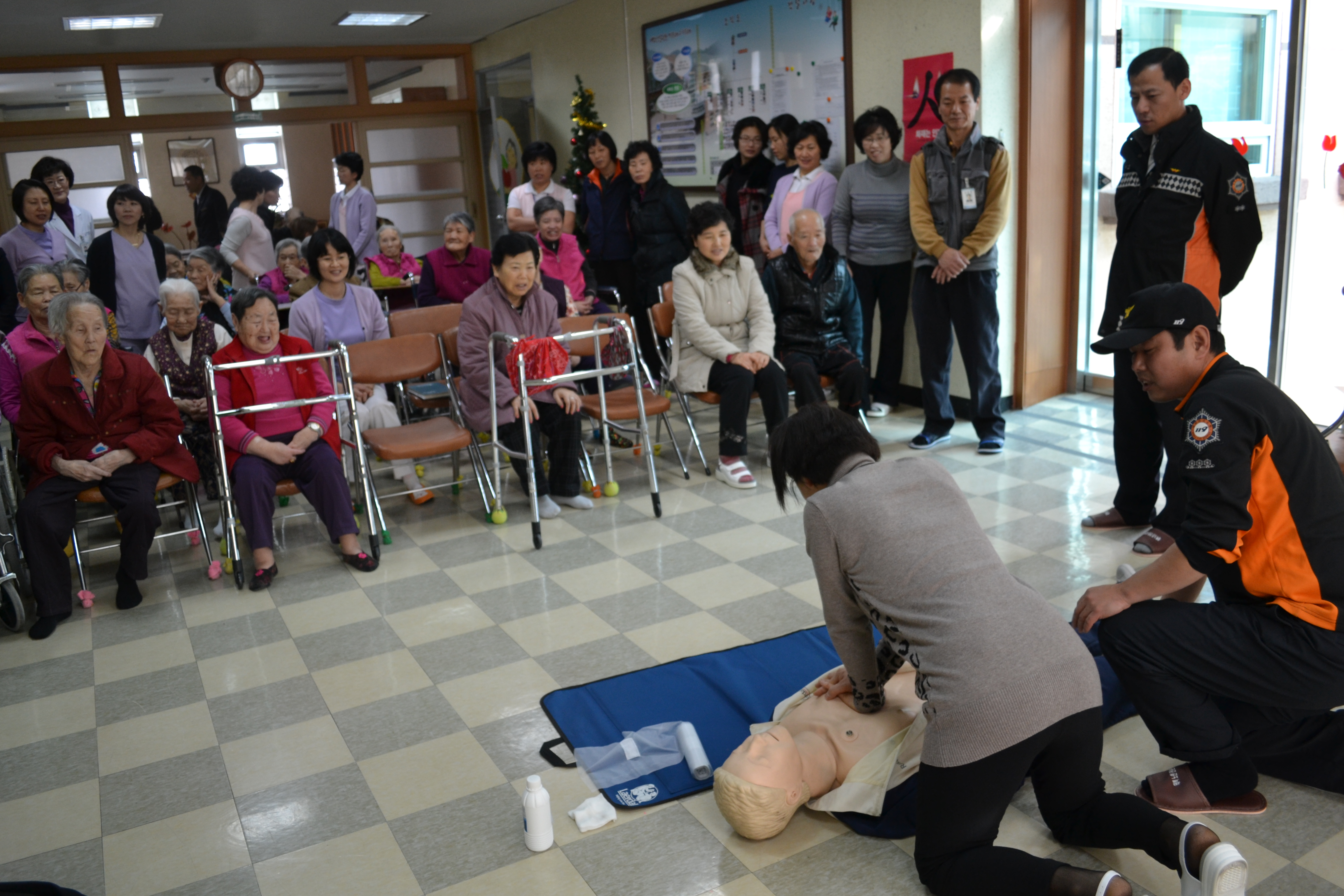 이에 유사시 단순하지만 유용하게 사용 할 수 소화기구 사용법과 심정지 환자의 소중한 생명을 살릴 수 있는 “4분의 기적” 심폐소생술 체험교육을 실시하고 2부 순서로 어르신들을 모시고 다과회와 태백소방서 직원으로 구성된 음찾사(음악을 찾는 사람들) 위문공연과 함께 즐거운 시간을 보냈다.