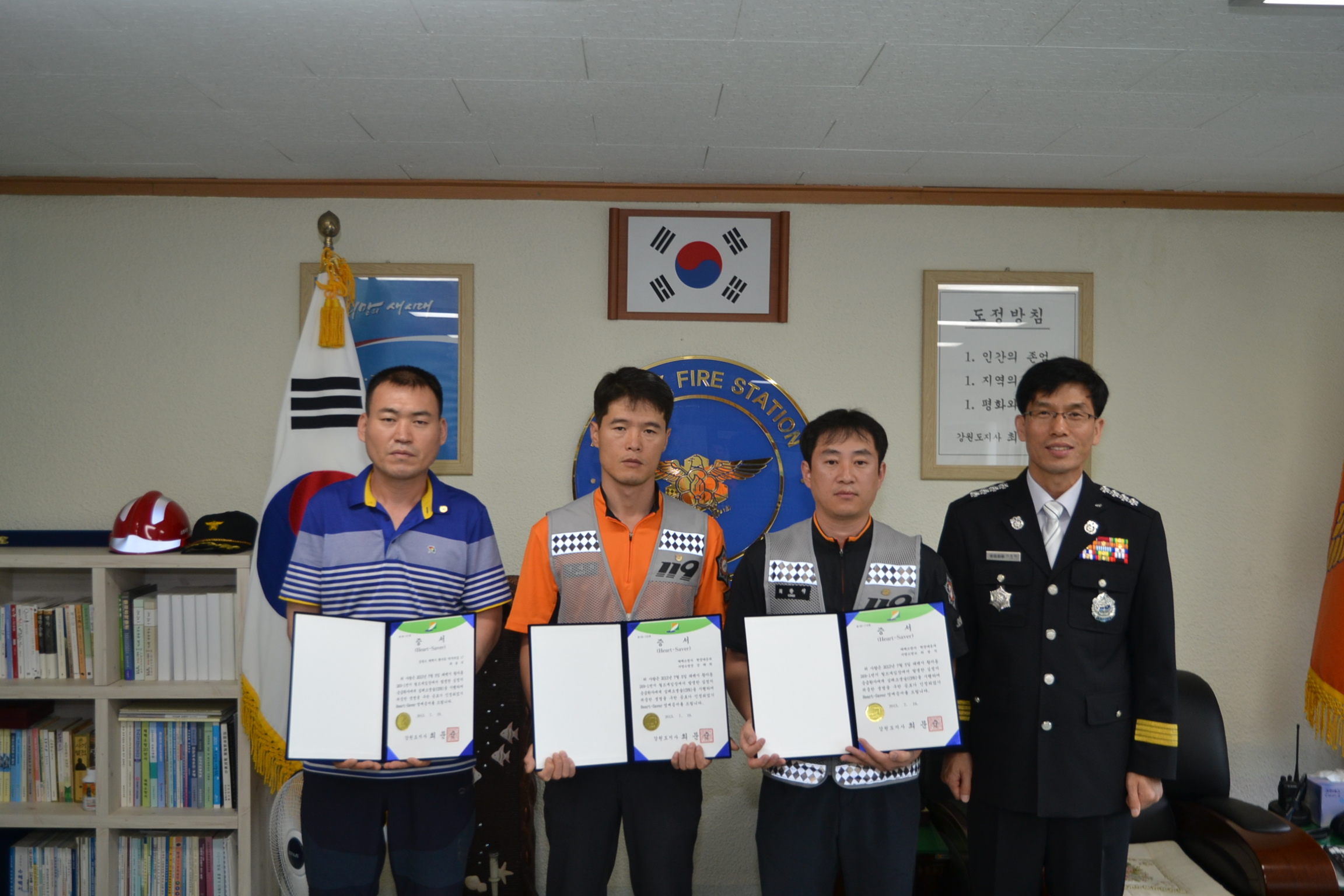 태백소방서(서장 이동학)는 24일 오전 10시 소방서에서 신속한 응급처치로 시민의 소중한 생명을 구한 화전119안전센터에 근무하는 소방장 강태희, 소방교 최광석과 일반시민 최용식에 대해 하트세이버 증서와 배지를 수여했다.
