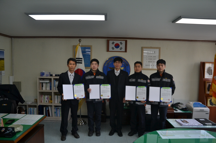 태백소방서(서장 이동학)는 17일 서장실에서 신속한 현장응급처치와 병원이송으로 심정지 환자를 소생시킨 태백소방서 김흥기 소방장, 김동현 소방사, 김우종 의무소방, 삼척소방서 김현수 도계119안전센터 센터장에게 하트세이버 증서와 뱃지를 수여했다.