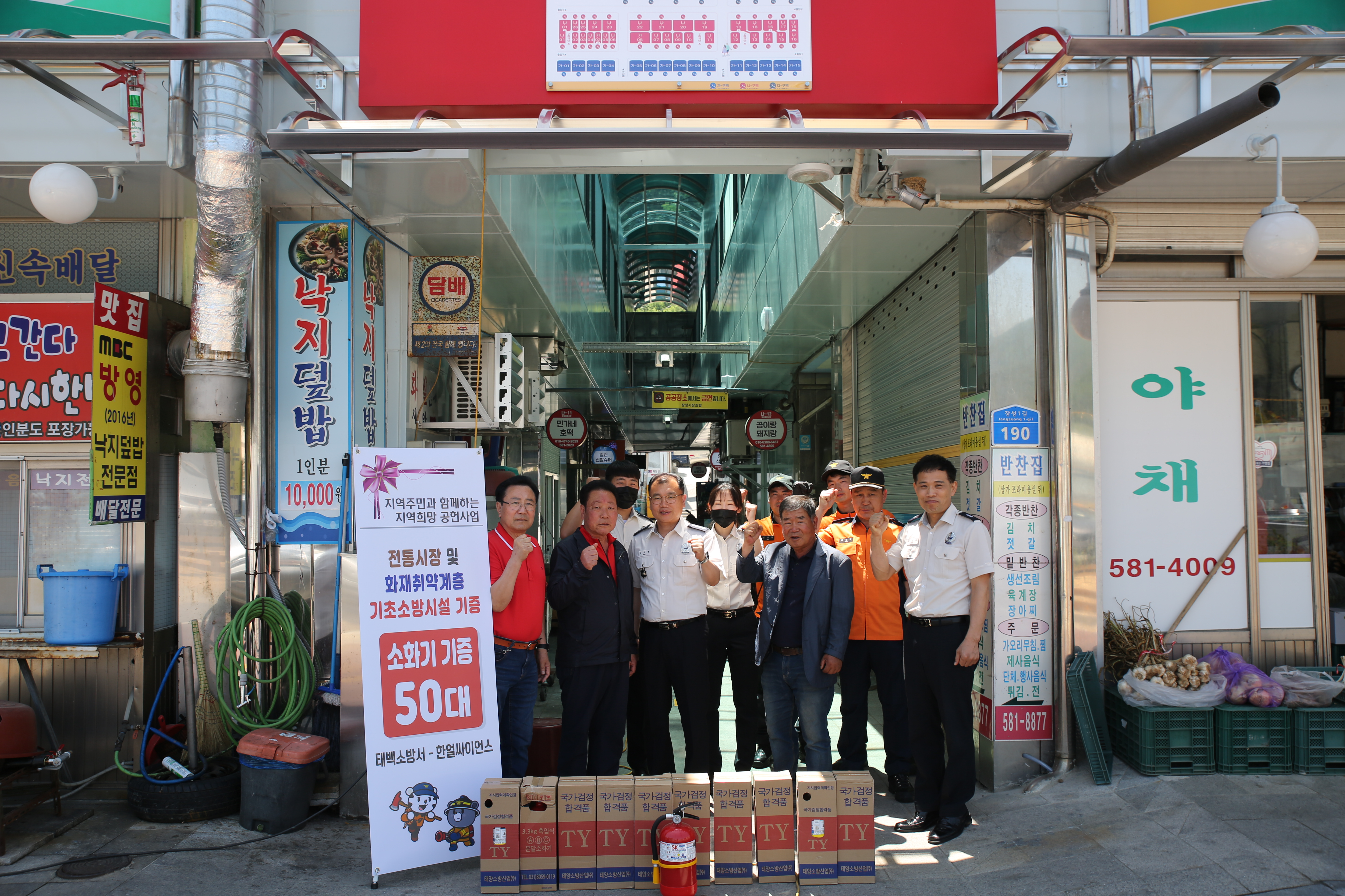 태백소방서(서장 최식봉)와 한얼싸이언스는 9일 11시 장성중앙시장에서 주택용 소방시설 소화기를 전달 하는 행사를 진행했다고 밝혔다.