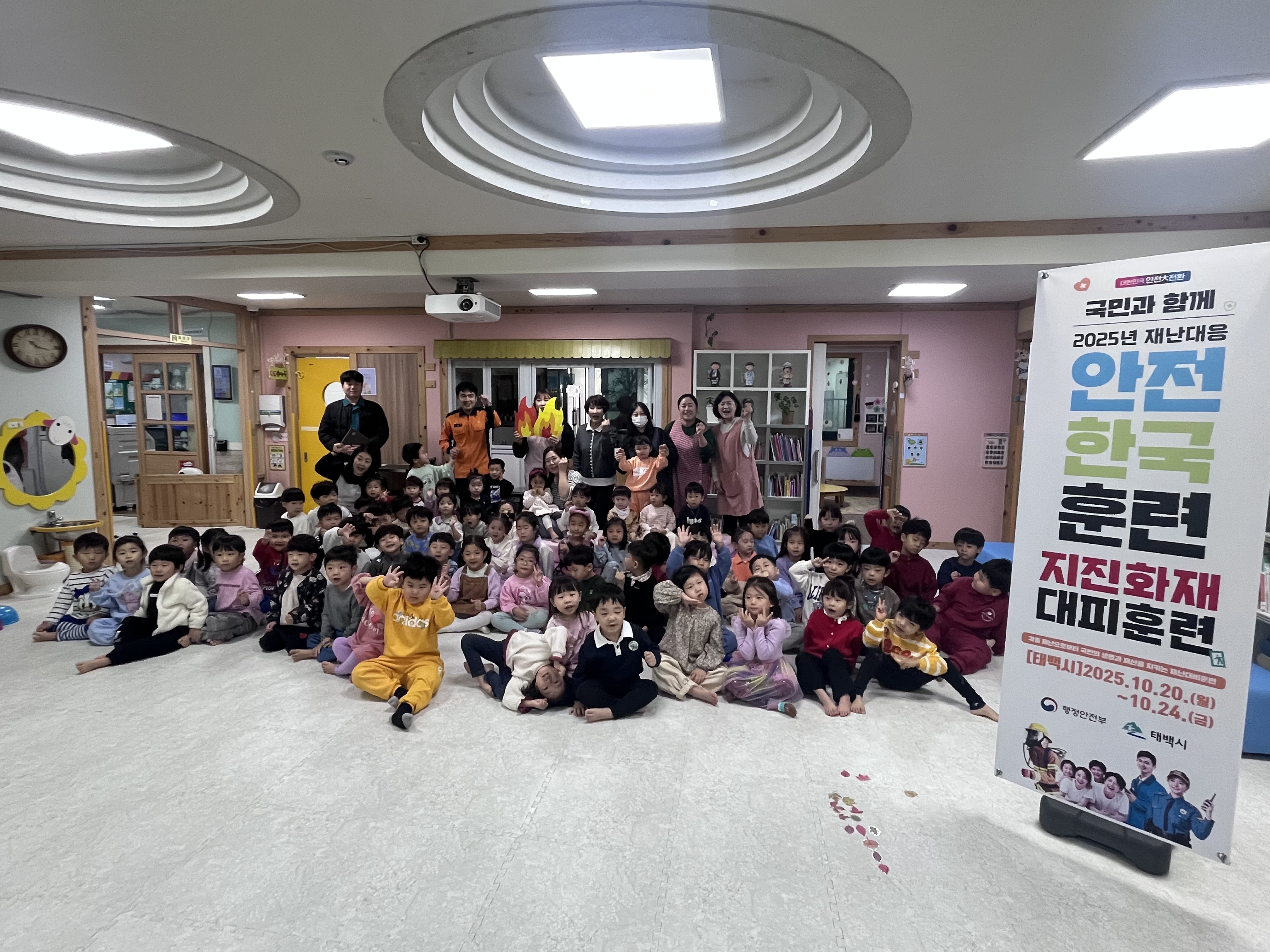 10월 22일, 태백시 안전과와 재난대응 안전한국훈련의 일환으로 하늘어린이집에서 원아들을 대상으로 화재대피훈련과 소화기 사용법 교육이 진행되었습니다.