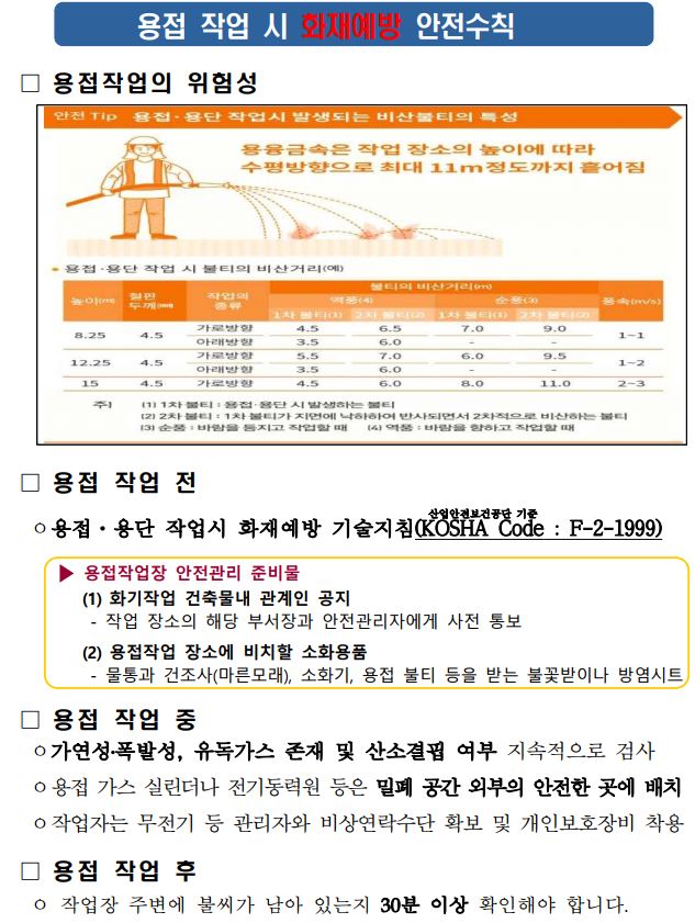 건축 공사장은 작업 환경 특성상 화재에 취약한 가연성 자재와 가스 등에 노출되어 있어 용접·용단 작업 시 작은 불티만 튀어도 쉽게 화재로 확대될 수 있기 때문에 각별한 주의가 필요합니다.