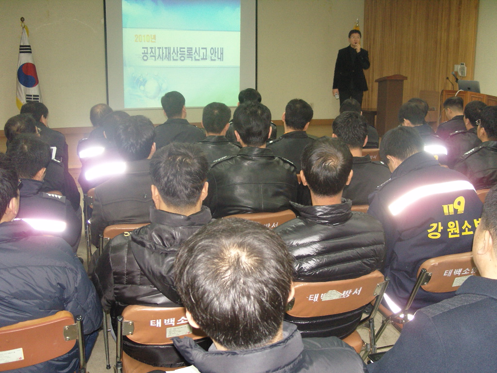 태백소방서(서장 정승진)는 12월 16일(수) 오전 대회의실에서 2010년 정기변동신고 대비 소방직 재산등록의무자 교육을 실시했다. 강원도 감사관 이종대 지방전산주사가 소방장 이상 전원을 대상으로 교육했다.
